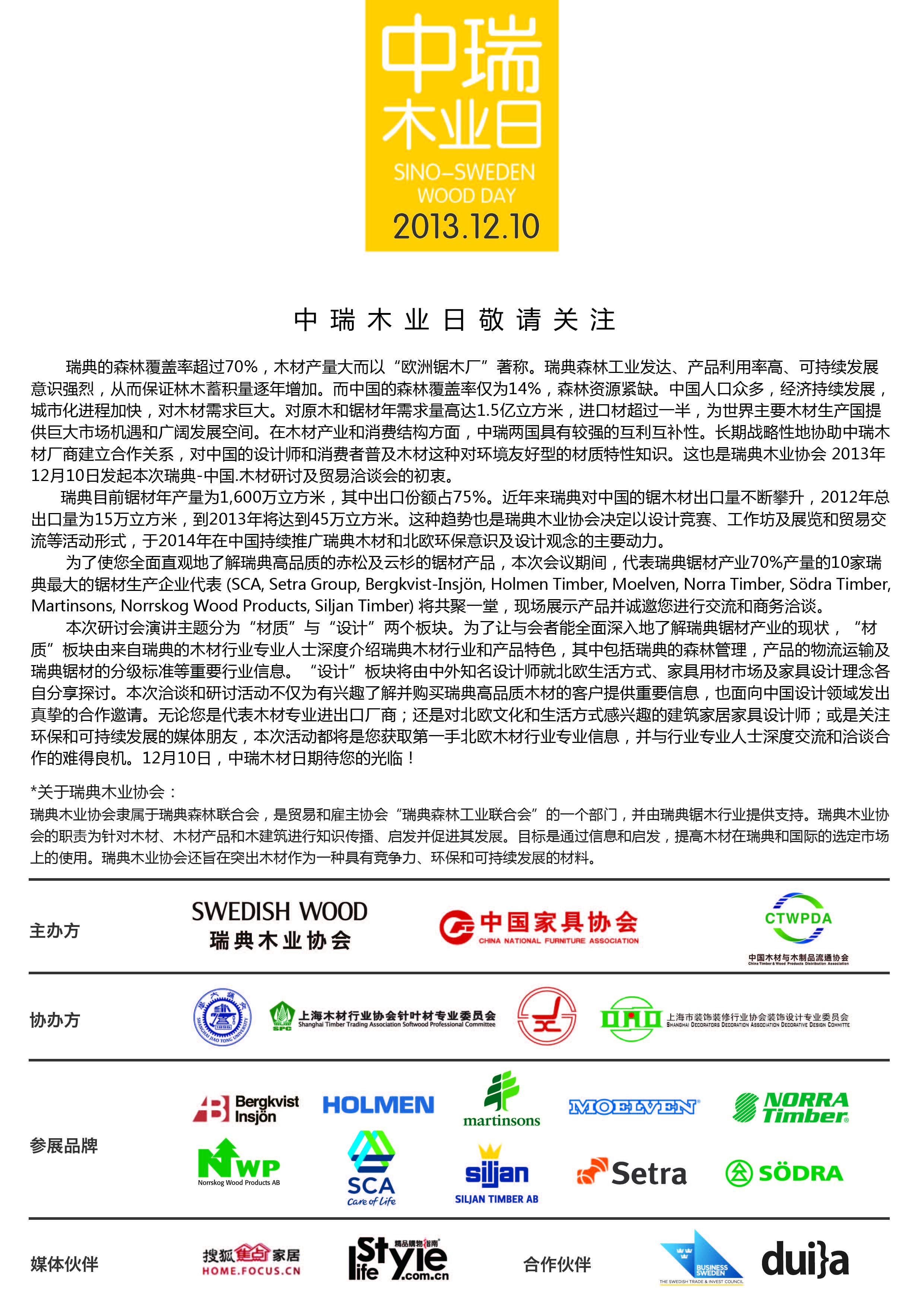 此次会议分为上下午两个阶段,来自国内的知名家具企业负责人将做精彩演讲,与会者将了解到瑞典锯木产业的状况,其中包括瑞典的森林管理,产品的物流运输及瑞典锯木材的分级标准等重要信息。