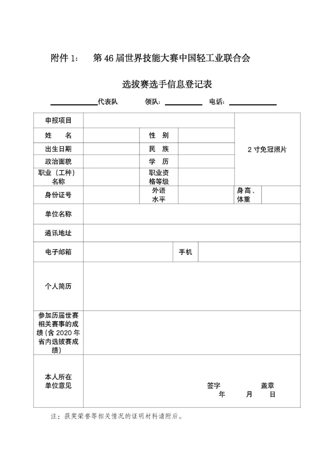 附件1:第46届世界技能大赛中国轻工业联合会选拔赛选手信息登记表