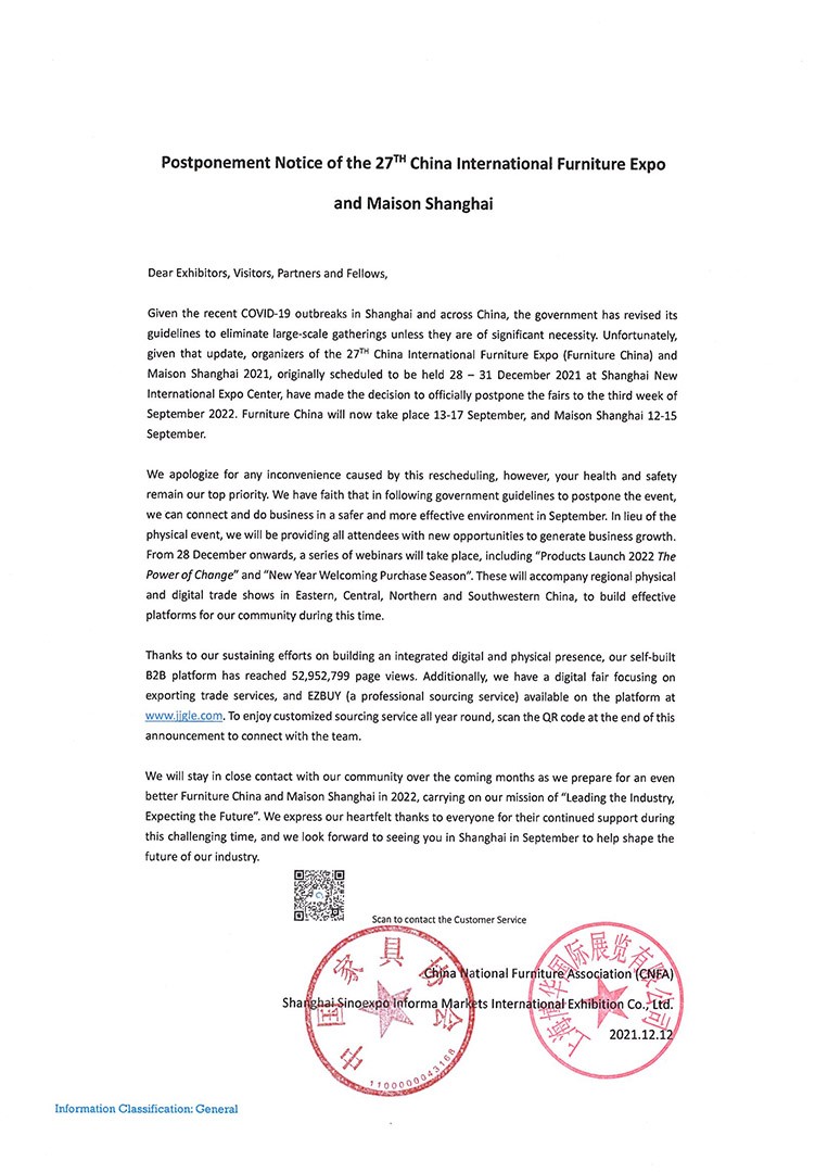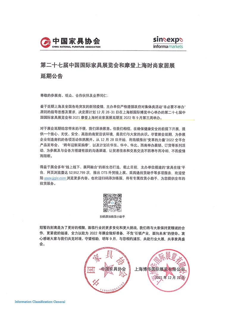 第二十七届中国国际家具展览会和摩登上海时尚家居展延期公告