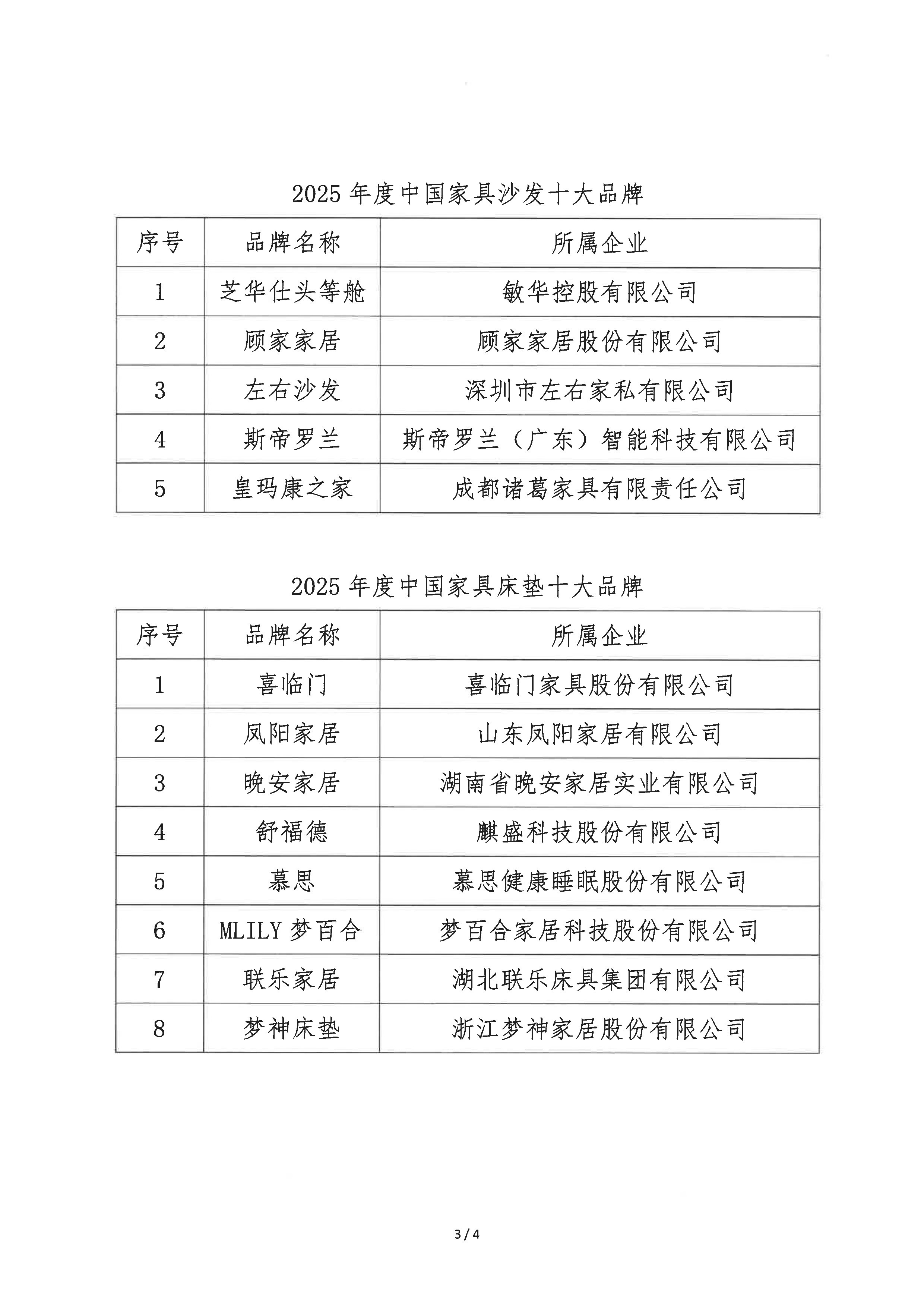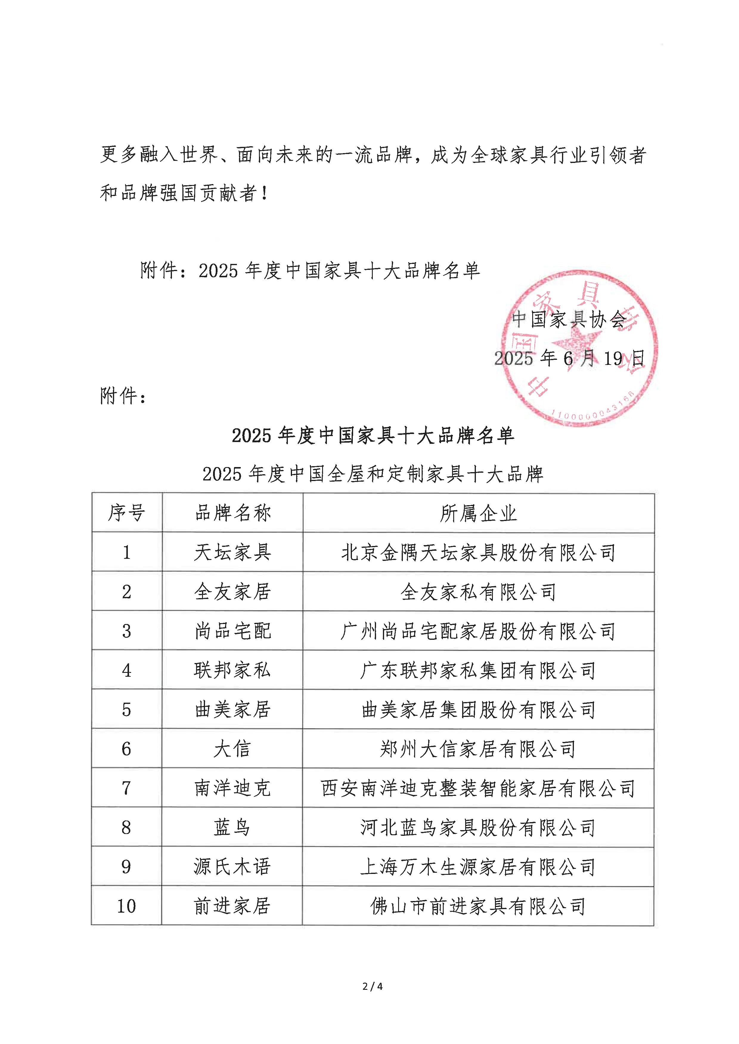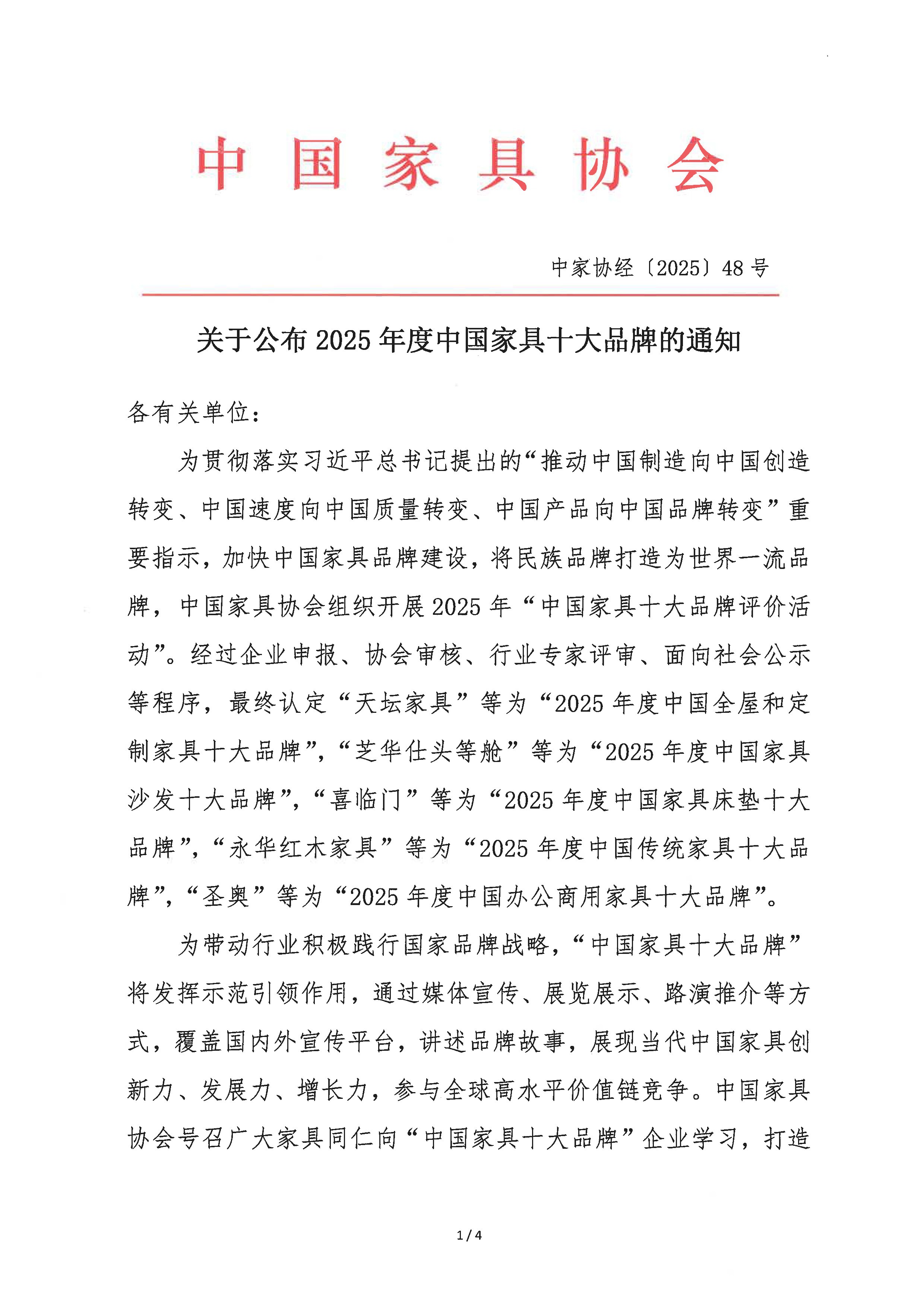 关于公布2025年度中国家具十大品牌的通知