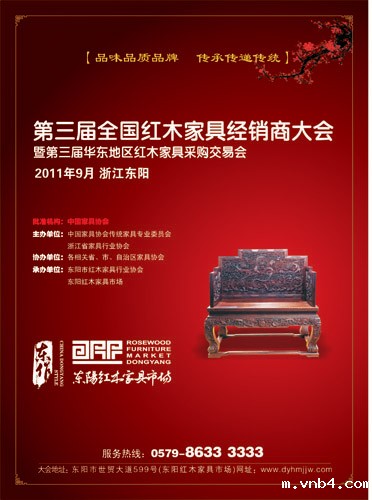 为促进中国传统(红木)家具行业的发展,为全国红木家具生产企业与经销商、红木家具消费者及爱好者搭建一个良好有效的沟通交流平台,构建全国分布或红木家 具营销网络,为各地商家提供信息资源查询和决策。决定于2011年9月17日-9月19日举办第三届全国红木家具经销商大会,现将有关事项通知如下: