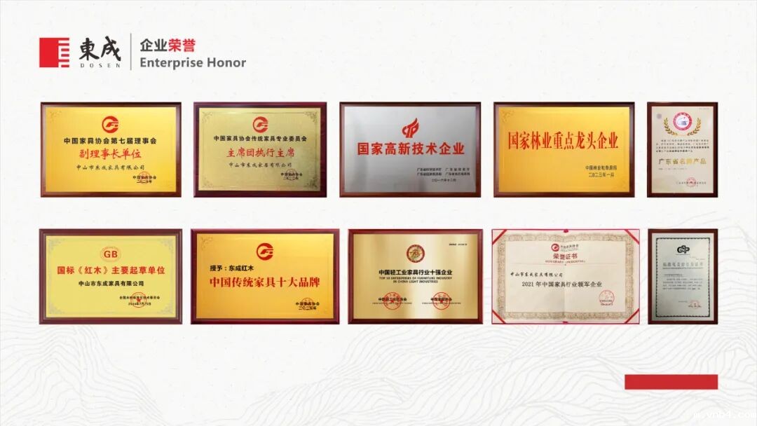 自创立以来,东成红木始终贯彻“小细节成就大品牌”的品牌理念,始终贯彻“注重创新,注重品质,注重服务”的发展方针。历经35年的高质量发展,在国内红木家具行业有着良好的知名度和美誊度,荣获“中国传统家具十大品牌、中国轻工业家具行业十强、国家高新技术企业、国家林业重点龙头企业、国家AAAA级标良企业、国标《红木》主要起草单位、广东省名牌产品、广东省著名商标、广东省守合同重信用企业、广东省林业龙头企业”等众多荣誉称号。