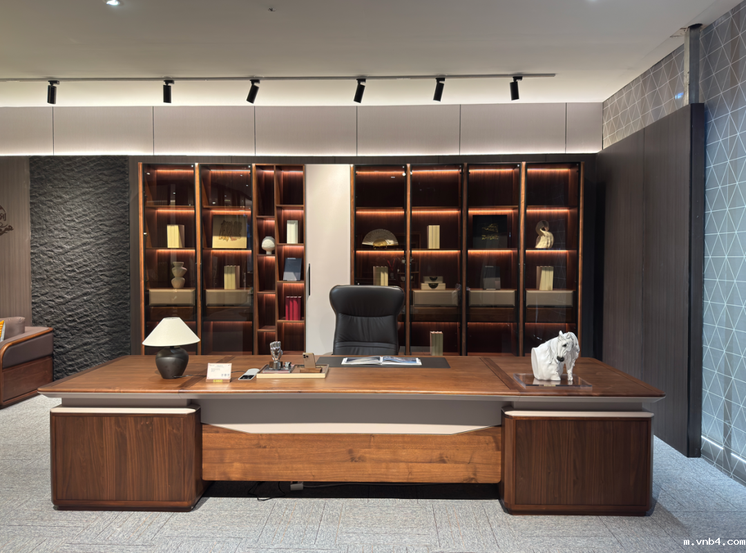 精选优质实木匠心打造的大班台,天然木纹如流动的艺术脉络,每一寸边角都经精细打磨,温润触感与精致工艺尽显;搭配沉稳真皮座椅,背后陈列柜暖光映着藏品,从选材到工艺都藏满“高端与匠心”,在此办公,思路随空间精致感愈发开阔,商务洽谈时更能借这份实木品质传递专业底气。