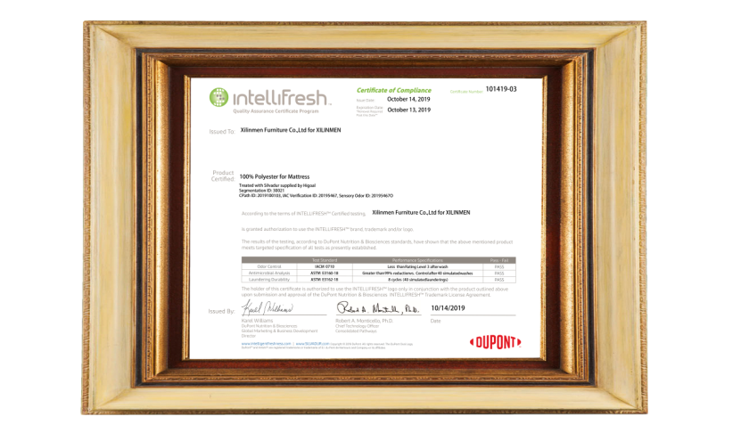 其中,美国杜邦Intellifresh技术的抗菌率高达99.9999% ,高于国家标准100倍,可以祛除环境(霉味、烟味)和体味(汗味、狐臭、脚臭、童尿等)造成的异味。即使经40次反复洗涤,抗菌率仍能保持99.9%以上,抗菌更持久,面料不黄变,让床垫使用多年后,历久弥新。大大增加了产品在保卫家人健康方面的核心竞争力。