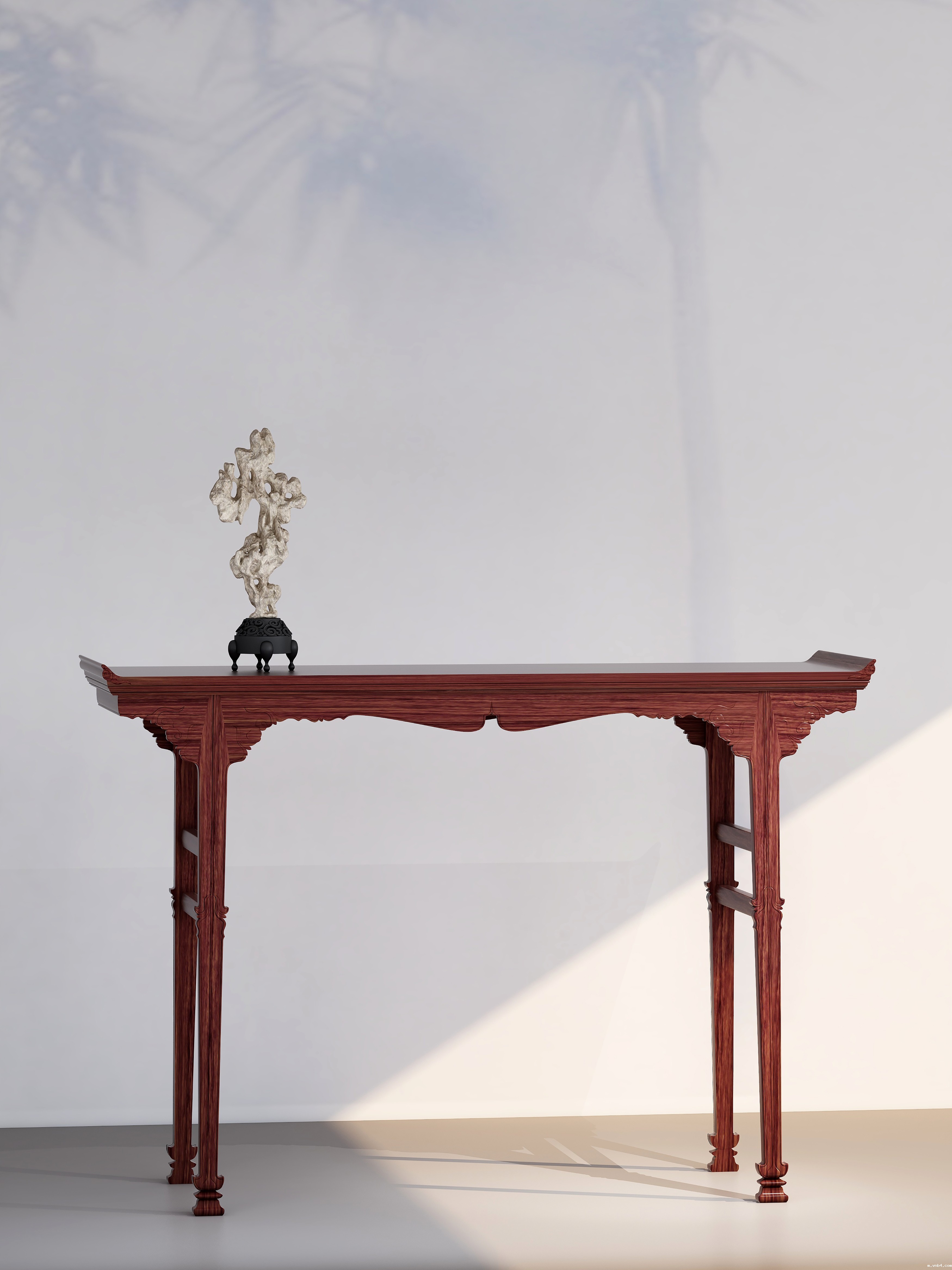 此案典雅华贵,案面两端翘头,壶门牙条曲线优美,两边牙头锼出线条流转之如意云纹,牙条、牙头边起阳线,腿足与案面以插肩斜榫接合,案腿末端刻如意雕花,且有阶形托足。壶门造型当由初唐壶门券口式箱形家具发展而来。体型较小之翘头案已见于宋人画册,如《天籁阁旧藏宋人画册》,部份画册即载于王世襄,《明式家具研究》。同款家具曾由香港著名收藏家洪建生先生收藏,并收录于《洪氏所藏木器百图》。