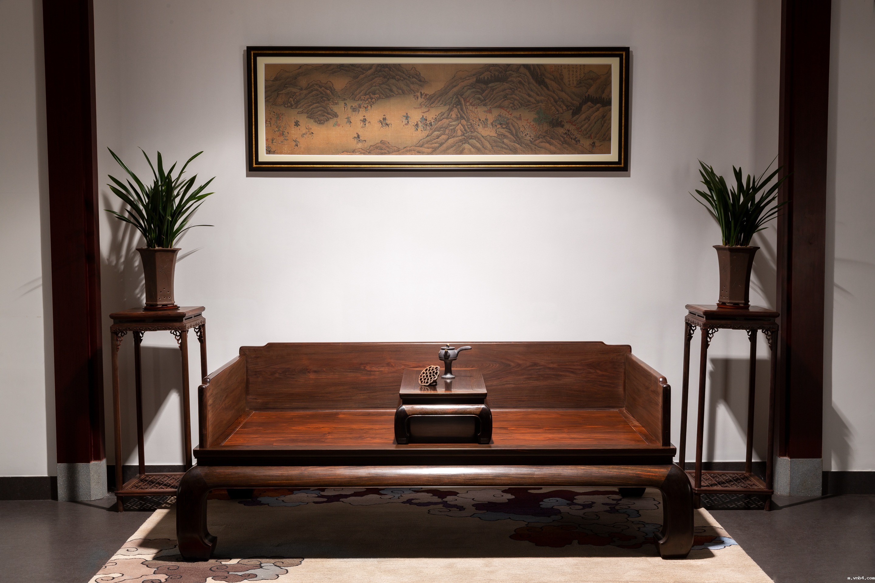大红酸枝,学名交趾黄檀,在中国古代便是“三大贡木”之一。如今大红酸枝已被世界自然保护联盟濒危物种红色名录(IUCN RED LIST)列为易危物种。独板,顾名思义就是用一整块木头做成的板材。因为独板需要比较大的木材,而红木本身就稀有、出材率低,生长时间又特别久,所以,独板红木家具不论是在收藏界还是在市场上,一直都较为稀缺。此款三围独板罗汉床,通体老挝大红酸枝老料,用料硕大厚实,稀缺的独板材料,且纹理自然灵动。采用精磨工艺,从800目砂纸,一直打磨至7000目砂纸,器物表面光洁素雅,原材料油性释放形成天然包浆美感。