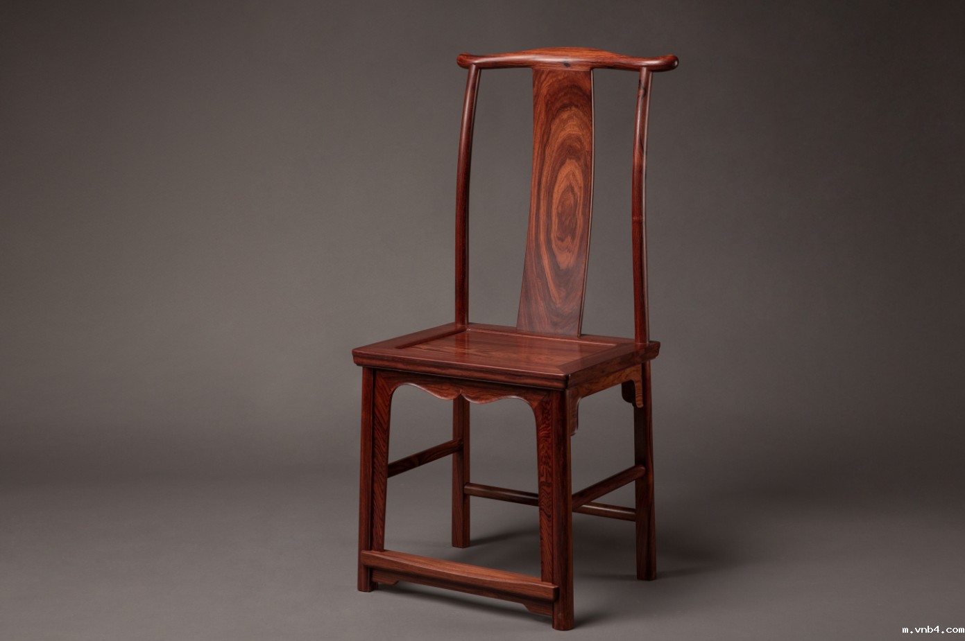 椅子搭脑两端微微翘起,向后兜转,结尾浑圆美观,中部削成斜坡成枕背。光素靠背一弯做,与向后弯的后腿上截在空间划出两个反方向的弧度,曲线圆劲有如雕塑。椅盘下正面券口牙子锼出正中有尖的壶门式轮廓,边沿向外斜削起线,这种卷转圆婉而线条犹劲的线脚,江南地区称之为“碗口线”。此同款灯挂椅收录于《明式家具萃珍》、《明式家具二十年经眼录》,由美国前加州中国古典家具博物馆旧藏。