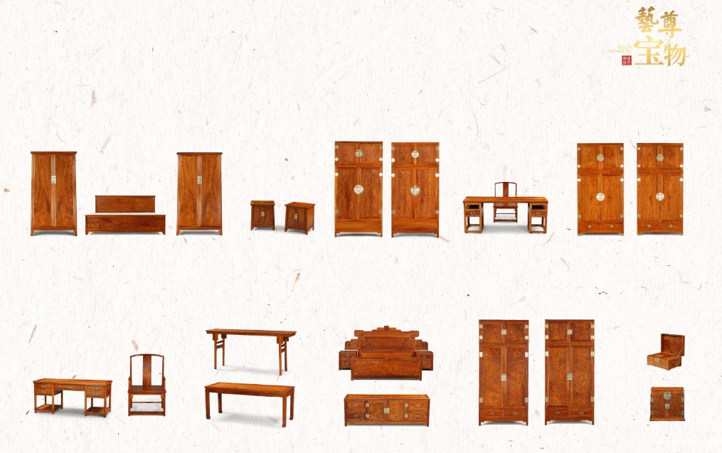 《天下第一黄》二十三件成套家具由同一株树龄逾千年,重约7.86顿的黄花梨原木制成。一木一堂,天下无双,也因此获得了大世界吉尼斯记录。天地玄黄大美有三:一在其料天下无双;二在其工鬼斧神凿;三在其思修身齐家。包天伟通过此作传达了中国人家国理念中的美满与圆融,既彰显了中华文化神韵,又呈现了黄花梨极致的高贵,再辅以当世精工,成为了名副其实的“天下第一黄”。
