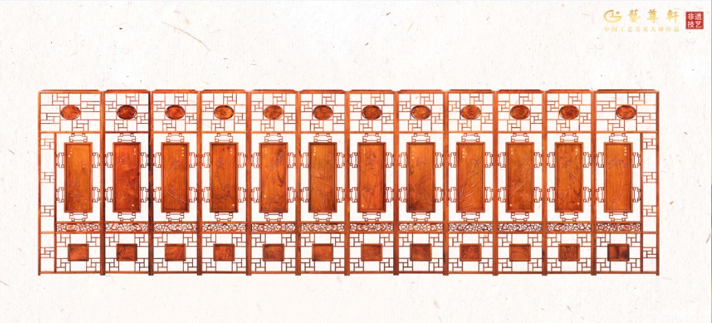 围屏为黄花梨制,三抹十二扇。正面屏心铲地浮雕十二分开心《百子图》,背面屏心以相同技法雕十二月令花卉图。屏心上下两端分别嵌入圆、方形瘿木,意为“天圆地方”。裙板装透雕苍龙教子纹的绦环板,连接处的牙子均攒接成棂格样式。十二分开心《百子图》雕刻内容为 :“一刻千金、两小无猜、三元及第、四方招财、五谷丰登、六畜兴旺、七巧玲珑、八方进宝、九州来贺、实实孝敬、食衣无忧、十二分开心。”“十二月令”花卉雕刻内容为 :“一月山茶、二月蟹爪莲、三月桃花、四月玫瑰、五月芍药、六月荷花、七月百合、八月美人蕉、九月兰花、十月芙蓉、十一月菊花、十二月腊梅。