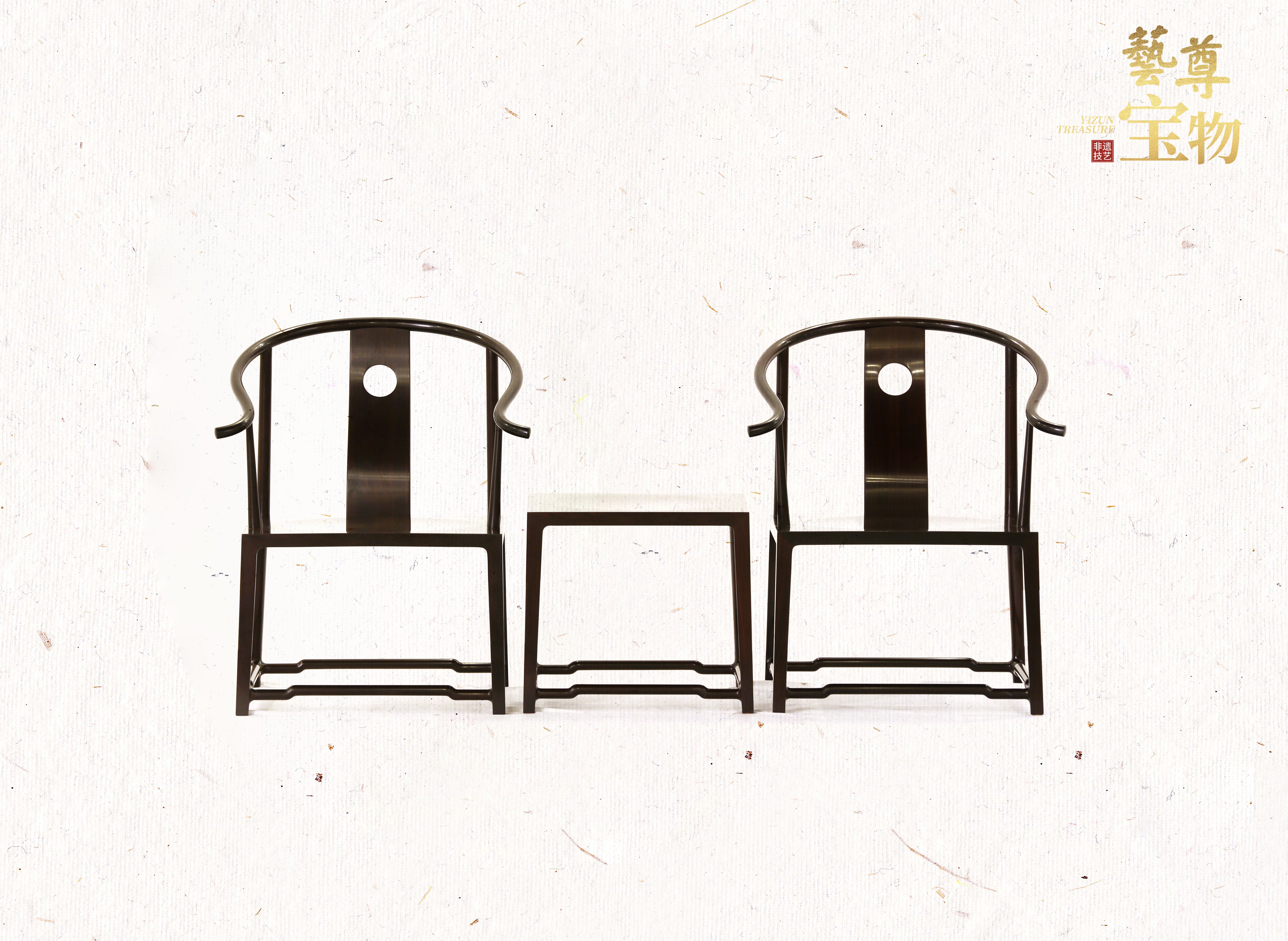 《天圆地方圈椅》选用酸枝木为材,部件经过专利工艺特殊处理,在纯手工打磨、不上漆料的前提下产生了自然光润的葆光。通体全无雕饰,仅在靠背板上透雕圆形开光,与圆椅圈、方座面共同形成天圆地方的道法呼应。该作品为无缝榫卯的代表作之一。
