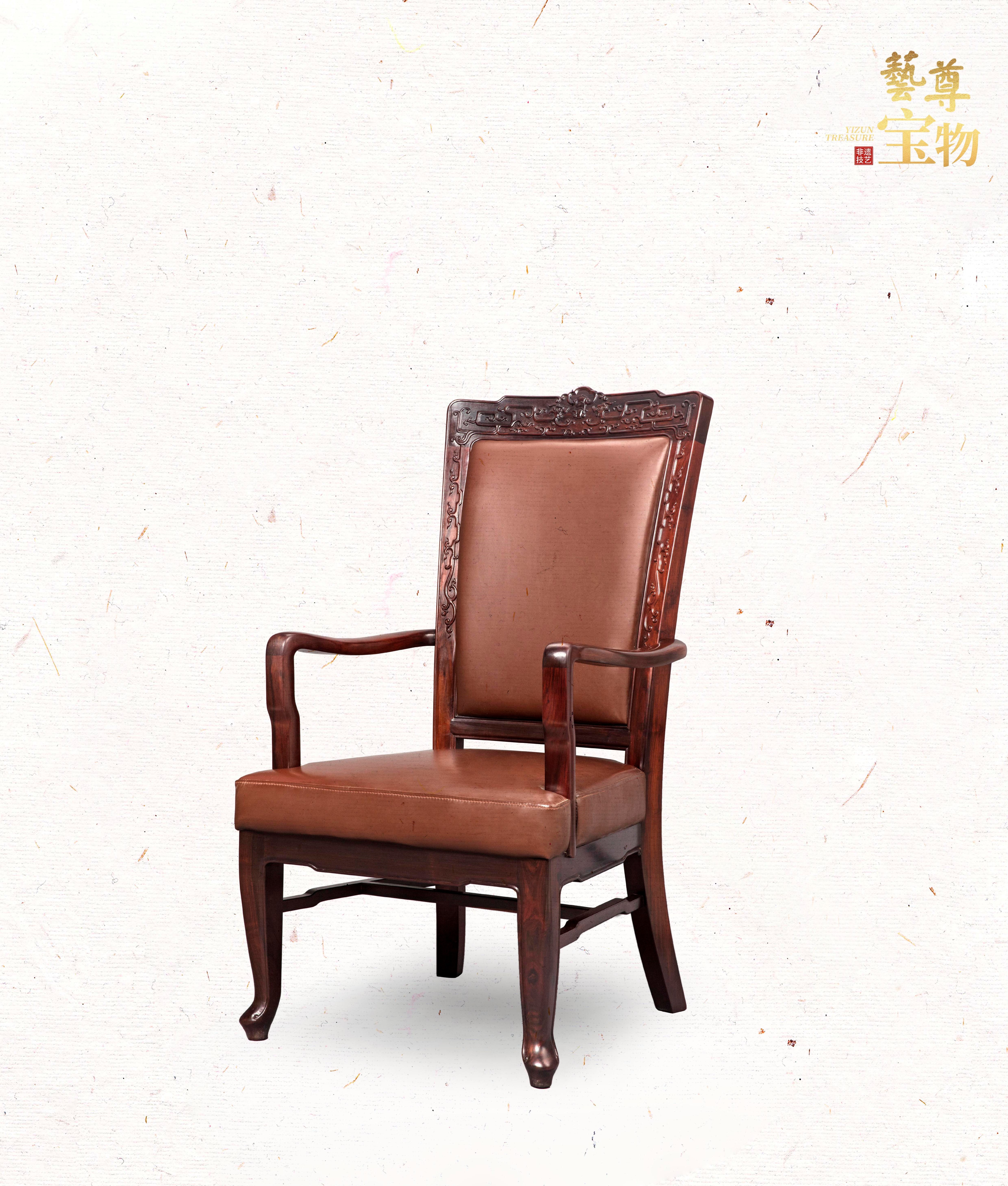 这件作品在延用传统高档红木原材的基础上融古汲今,合奏了一曲中西合璧的乐章。扶手椅的框架为古典宫廷中“三大贡木”之一的交趾黄檀,靠背、座面则使用现代家具常用的皮质软垫。通过细节上推敲,在形式、美感、舒适度上成就了和谐的共存。搭脑部分以花式弯曲凸显中部的夔龙卷草如意云纹浮雕,整体略做弧面给人以合围的安全感,同时也与上宽下窄的靠垫形成视觉上的对照。前腿造型改良自中西合璧的洋脚式,后腿则一木连做引出侧脚,前后互补,造就沉稳有力的美感。平直的鱼肚式牙板、腿间的工字式横枨,于简约中体现古今文化的纵横相连。内涵深远的设计、精细入微的工艺、耐人寻味的风貌、情真意切的家国情怀,就是我创作这件作品的动力。
