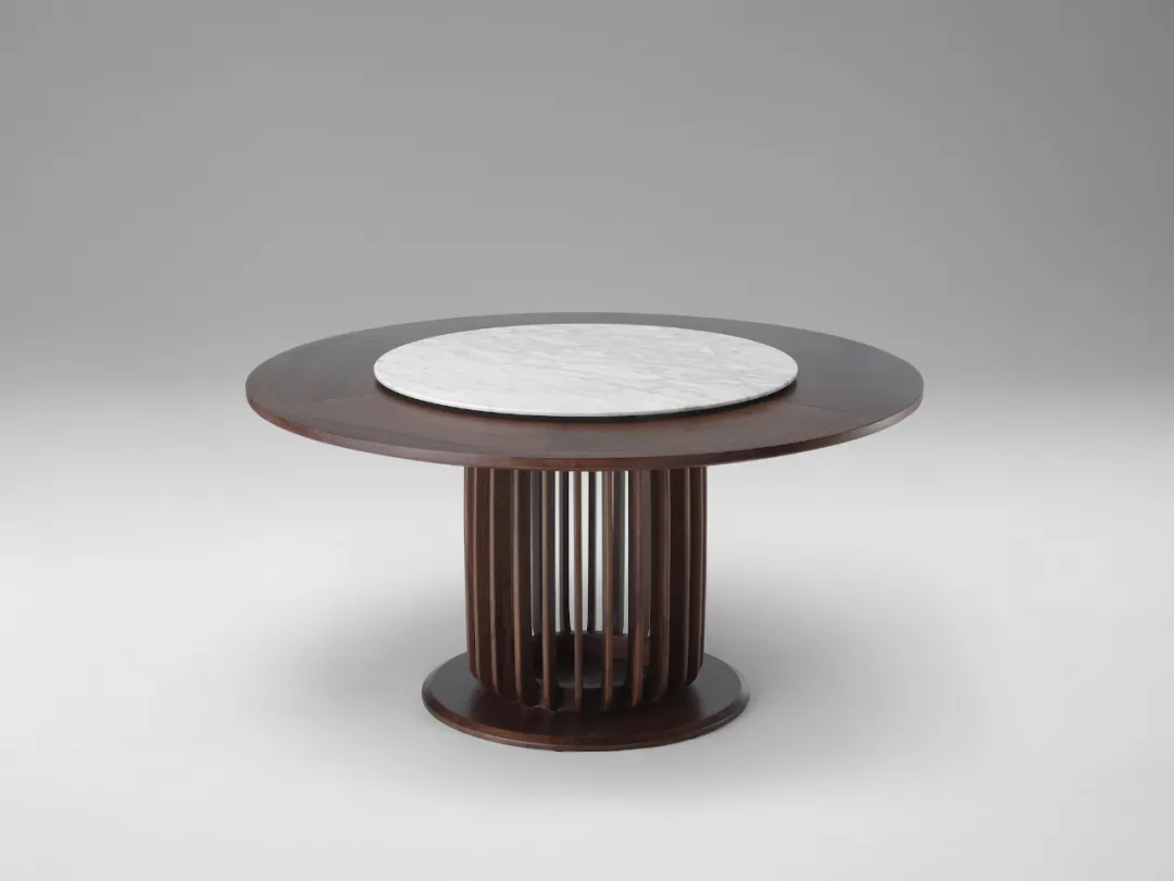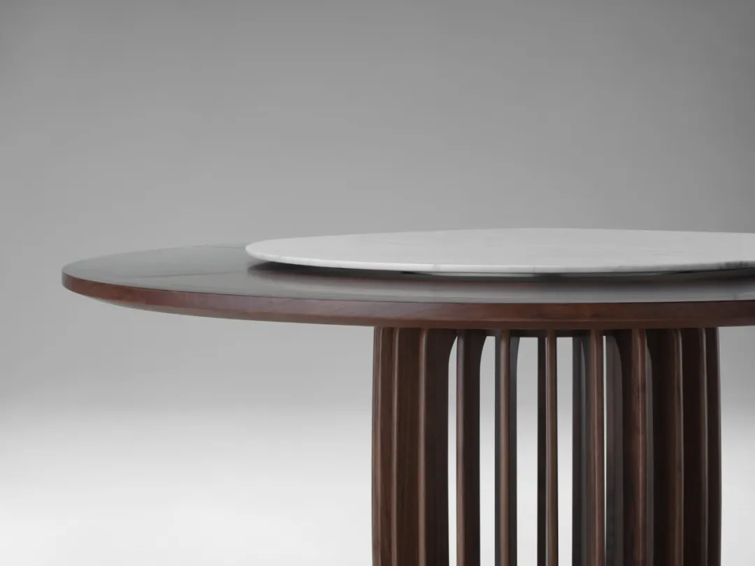 The dining table derives its idea from Chinese ancient lanterns. 24 curved solid-wood pieces are used to form the base which represents 24 solar terms. The all-year-round time circle implies satisfactory and happy life status. The edge of the table is polished delicately for user safety. Besides, based on an in-depth study on ergonomics, the base stretches inward to guarantee both stability and comfortable experience. Tow kinds of materials are combined for the surface -- walnut at the lower layer and marble at the upper layer. Their combination creates gentleness and elegance. The marble top is also rotational, suitable for flexible dining.