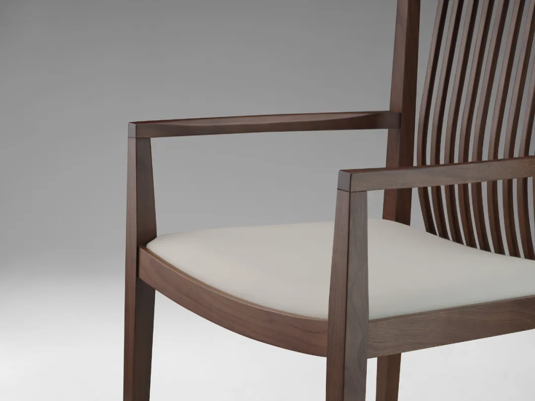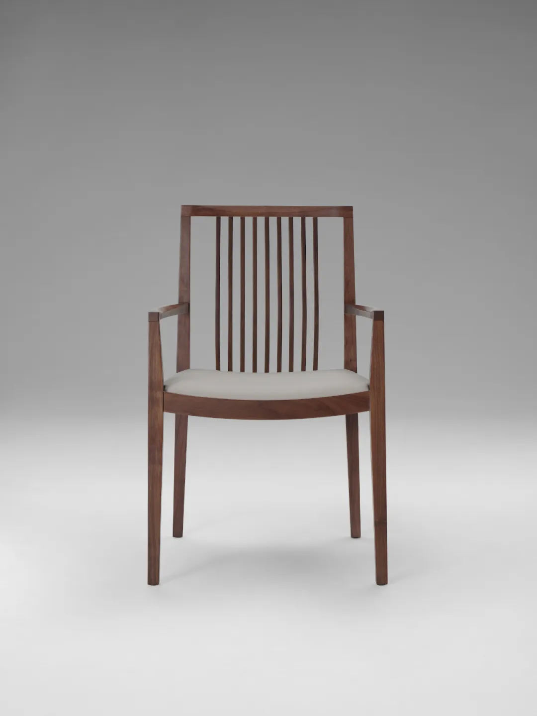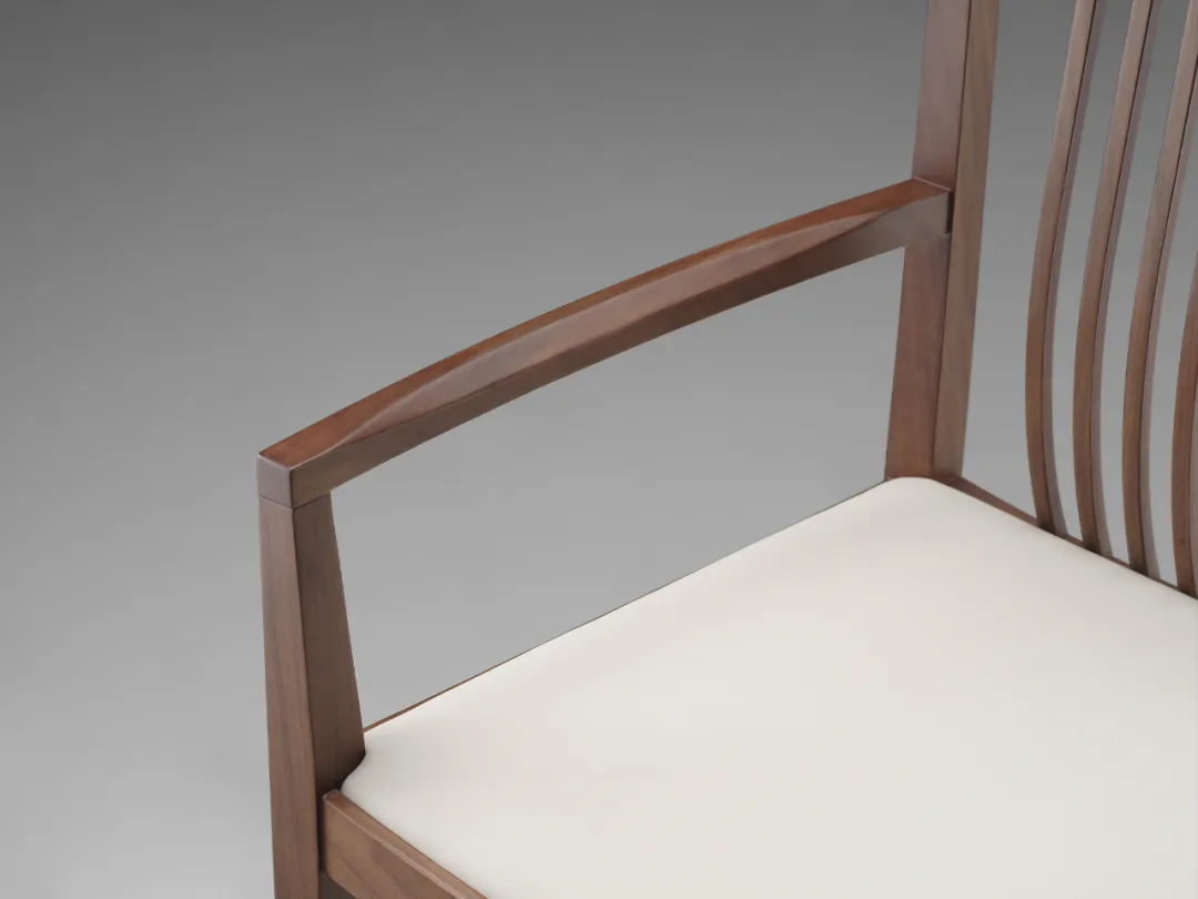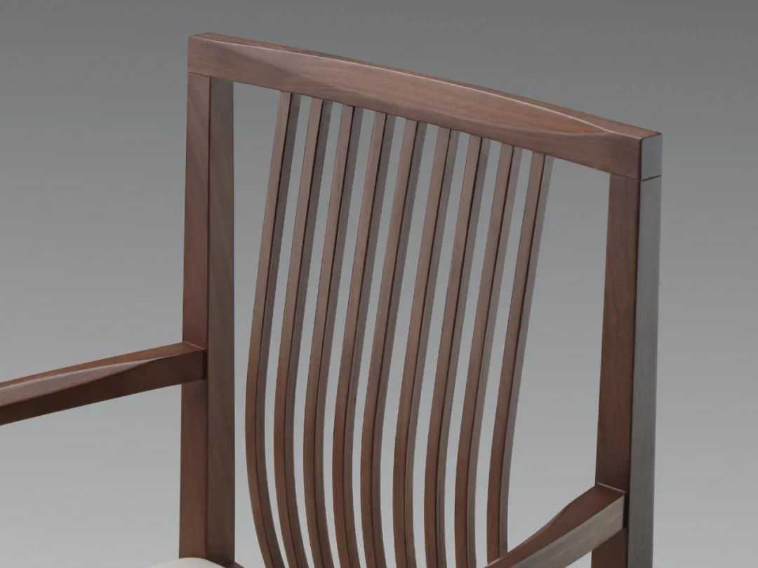 The design of the dining chair is based on the Chinese ancient comb chair. Its backrest contains nine solid-wood pieces at equal distances. Such form indicates permanent happiness and fortune in Chinese traditional culture. Both the armrest and backrest are polished into an accurate shape, which increases seating space and fits the human body curve.