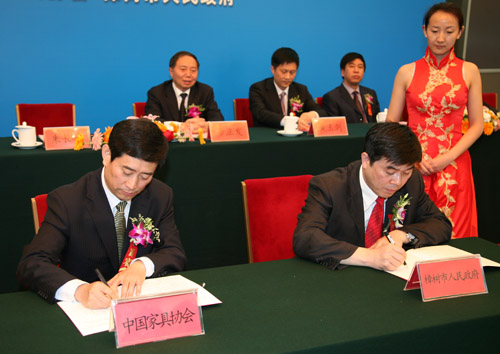 2012年4月14日下午,中国金属家具产业基地新闻发布会暨颁牌仪式在人民大会堂隆重举行。中国轻工业联合会会长步正发、 理事长朱长岭、名誉理事长贾清文、副理事长刘金良、副理事长兼秘书长张冰冰等领导以及江西省家具协会、企业代表出席颁牌仪式。 副理事长陈宝光主持会议。会上, 与樟树市人民政府签订了共建“中国金属家具产业基地”协议。步正发会长和朱长岭理事长共同为樟树市授牌。在共建期间,双方将在会展、研发、培训、检测、营销等项目上加强合作,促进该项目公共技术平台的建设,促进金属家具产业集群向科技型、环保型、创新型、富民型转变。