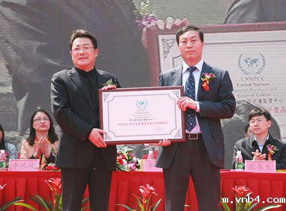 联合国物资采购监管中心部长齐国利(左)向香河家具城管委会主任王占栋(右)颁发“中国河北香河家具城家居产品采购基地”牌匾