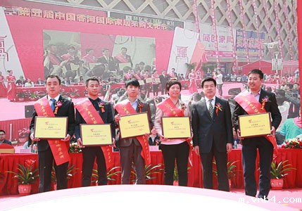香河县县长李桂强(右二)向获得“2015年度香河家具城十大影响力品牌”的企业颁奖