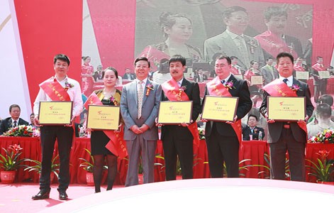 香河县委书记王凯军(左三)向获得“2015年度香河家具城十大影响力品牌”的企业颁奖