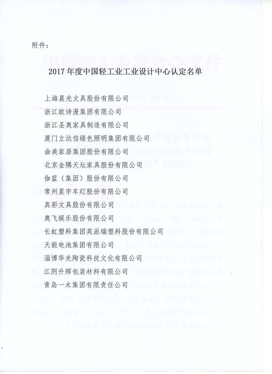 2017年6月26日,中国轻工业联合会公布2017年度“中国轻工业工业设计中心”名单。轻工行业15个单位的企业工业设计中心获得2017年度“中国轻工业工业设计中心”认定。其中,浙江圣奥家具制造有限公司、曲美家居股份有限公司、北京金隅天坛家具股份有限公司、青岛一木集团有限责任公司四家家具企业的工业设计中心获得认定。
