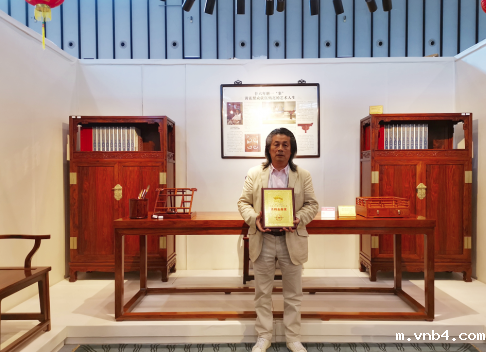 为推动工艺美术行业繁荣发展,中国工艺美术博览会特别举办首届“白鹤杯”工艺美术设计创新大赛。11月10日上午,2019中国工艺美术博览会“百鹤杯”工艺美术设计创新大赛颁奖典礼在南京国际博览中心举行。中国工美行业艺术大师、首届中国轻工“大国工匠”、伍氏兴隆董事长兼艺术总监伍炳亮参展作品《明式海南黄花梨书房系列》荣获首届“百鹤杯”工艺美术设计创新大赛最高奖——金鼎奖。该系列由一对万历柜、一架黄花梨四面平大案配官帽椅、两对大号四出头官帽椅配几和一张黄花梨三围独板罗汉床等家具组成,是伍氏兴隆此次参展一大亮点。