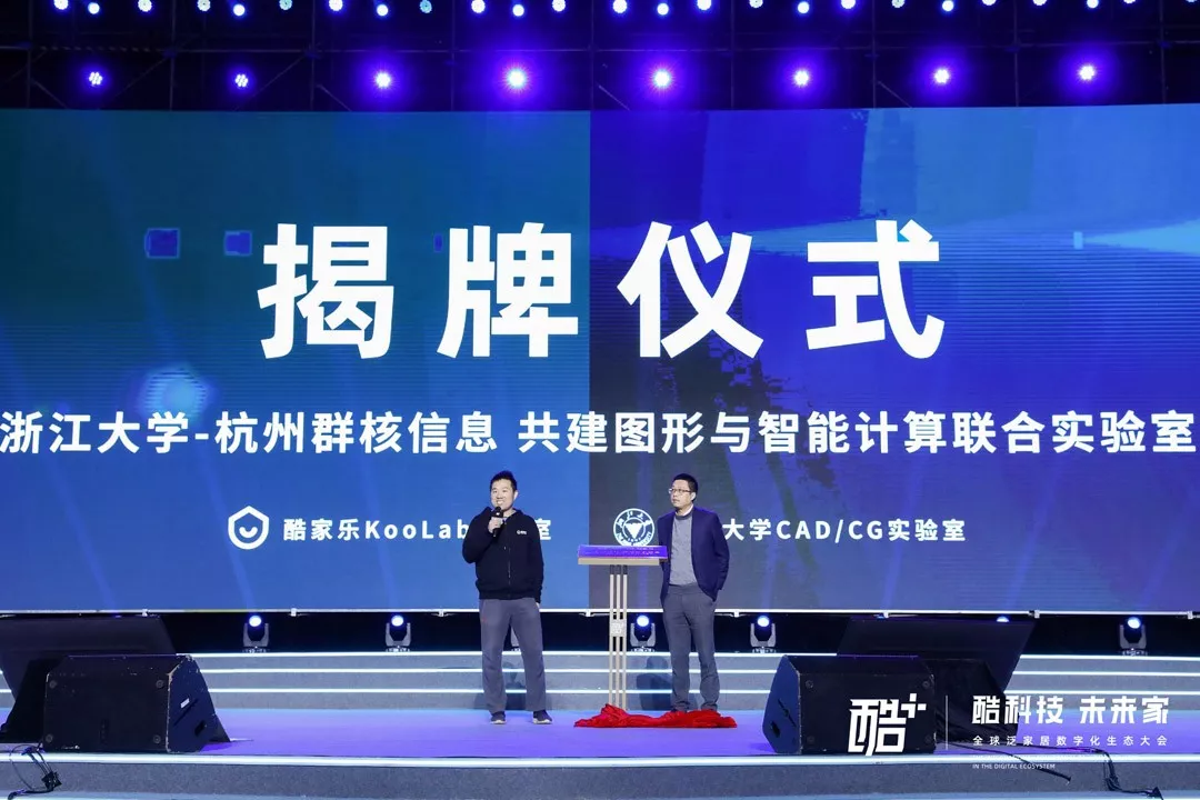 大会现场,酷家乐与浙江大学宣布共建图形与智能计算联合实验室,并举行揭牌仪式,双方将在计算机图形学和人工智能领域开展更加深入与具体的长期科研合作,支持相关技术在家装设计、建筑装修等行业领域的突破创新和落地应用。浙江大学计算机科学与技术学院院长陈刚和酷家乐董事长黄晓煌在现场致辞。