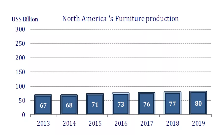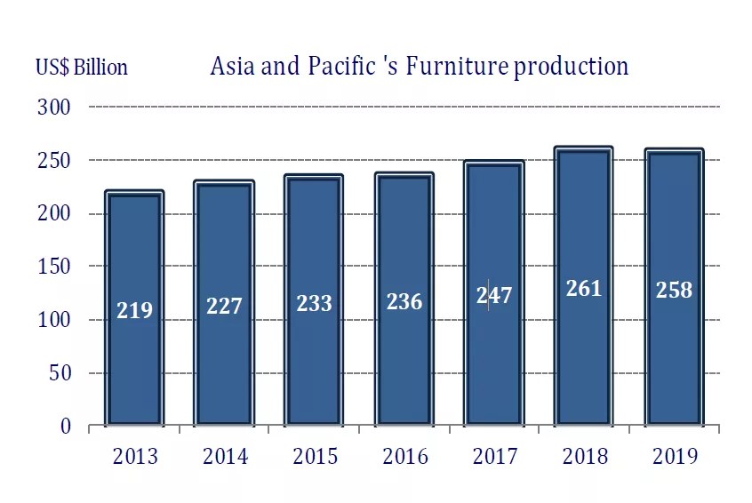 1、尽管部分地区家具生产出现了积极的增长,整体来看全球家具业在2019年陷入低迷,导致生产总额出现收缩。