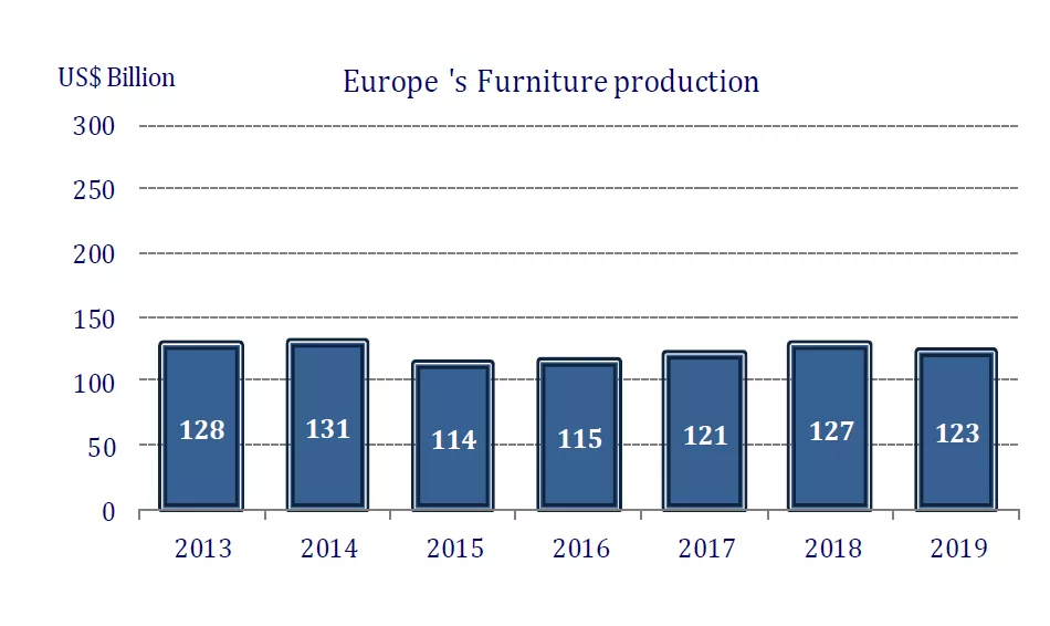 欧洲没能维持2015年以来的增长态势,2019年家具生产量回落。