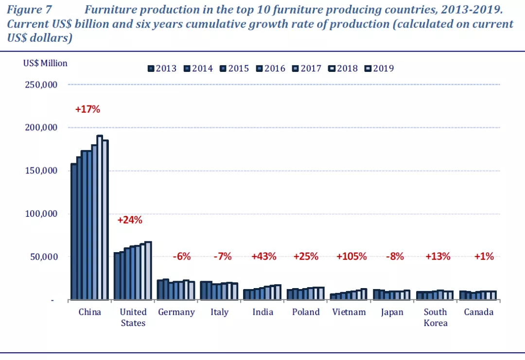 全球家居生产前十的国家中:中国、美国、德国、意大利等国是传统型家具生产大国,但是印度、波兰、越南近几年家具生产发展迅猛,尤其是越南的增长率十分可观。印度由于国内消费水平提高,市场需求庞大,刺激家具产业大幅扩张。具体情况我将在全球家具市场篇章中详细分析。波兰和越南的情况则恰恰相反,这两个国家在家具出口方面呈现优势,通过扩大国际家具市场的份额,增加了家具产量。