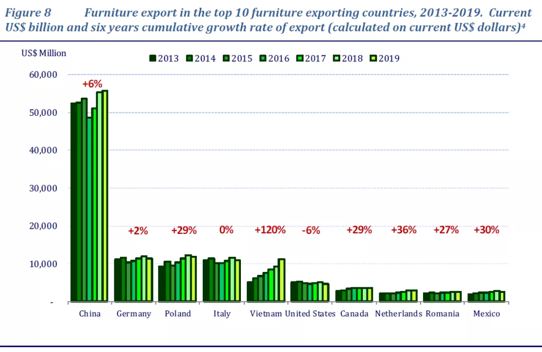 家具出口前十的国家中,中国依旧遥遥领先、位居首位(2019年,中国家具累计出口560.93亿美元,同比增长0.96%,约占全球总出口的35%)。波兰的家具出口量超过意大利,越南出口量翻了一番以上。随着新兴家具生产地区的发展及稳定,可以预测将来的全球家具业将出现新的重要参与者,世界范围内的家具商品流出地将从西欧、东亚、北美扩展甚至转移到东欧、东南亚地区。