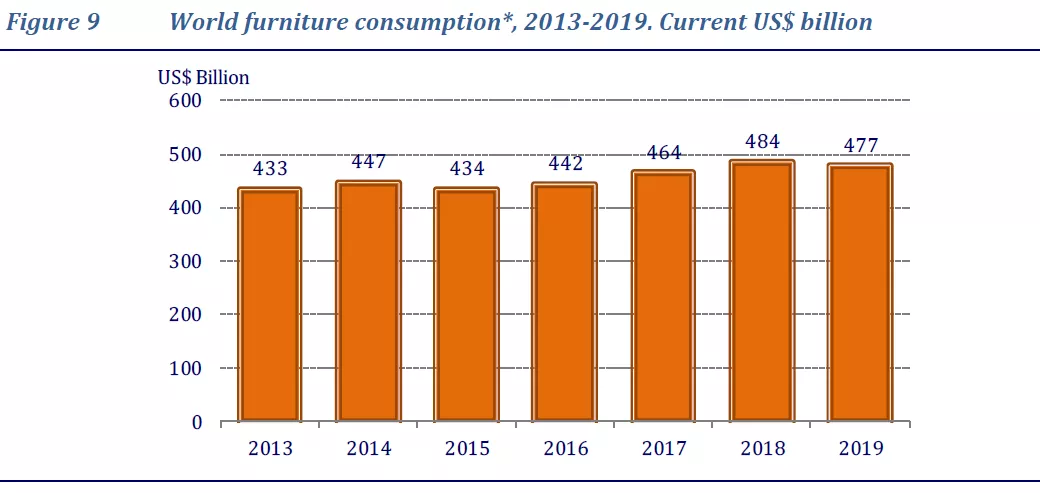 在生产背后支撑的是消费市场,收缩的家具生产量反映着降温的消费环境。2019年,世界家具消费额为4770亿美元,同比下降了2%。