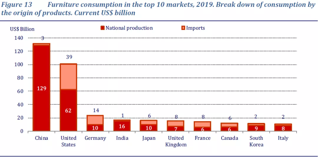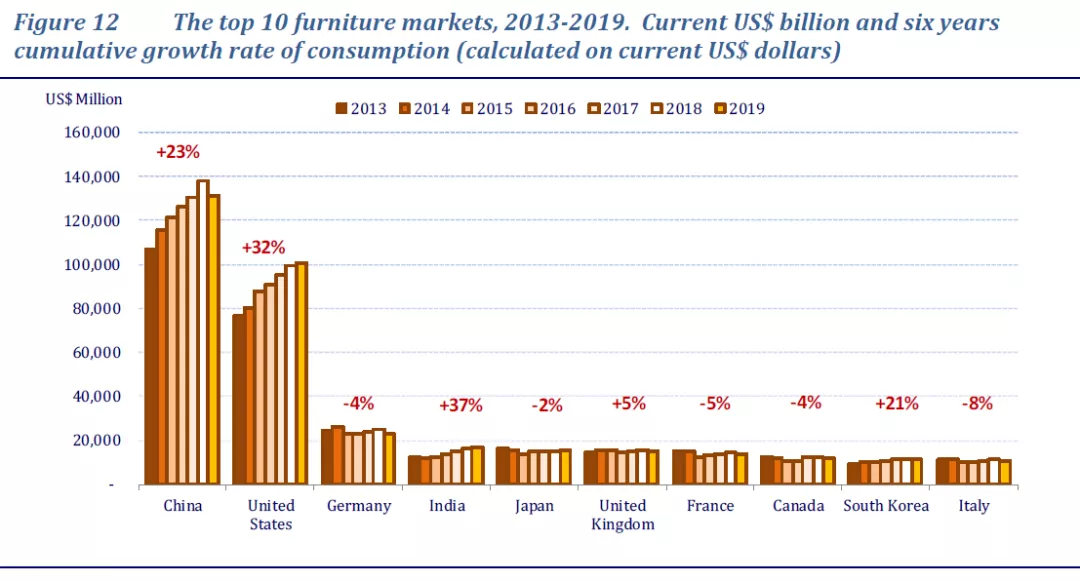 具体从国家看,主要的家具生产国正是主要的家具消费国,以下是世界上家具消费量排名前十的国家: