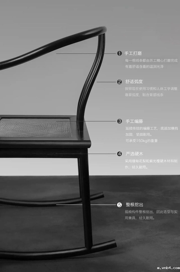 璞素坚持传统榫卯工艺与苏工匠造,榫卯是中式家具的经脉。云摇椅的高完成度,线条之流畅、构造之精妙,都得益于传统工匠的高超手艺。