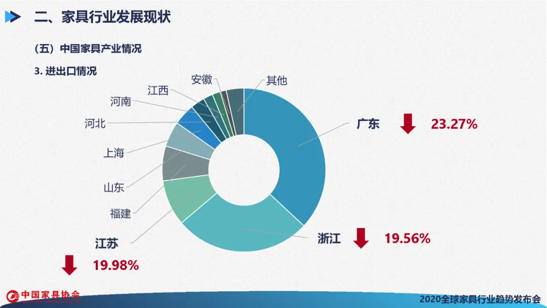 分地区看出口,中国家具出口主要集中在广东、浙江、江苏、福建、山东、上海、河北、河南、江西、安徽等地区。三大出口省广东、浙江、江苏合计占总出口的60%,三省出口同比降幅分别为23.27%、19.56%、19.98%,反映出全国大部分出口企业面临的严峻形势。