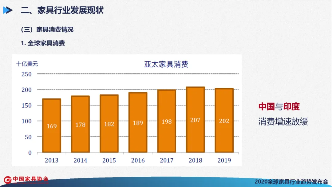 世界家具市场在2012至2018年期间逐年增长,2019年略有收缩,全球家具消费总额为4770亿美元,同比下降了2%。主要是因为占全球家具消费42%和26%的亚太和欧洲两大市场,消费出现了下降。