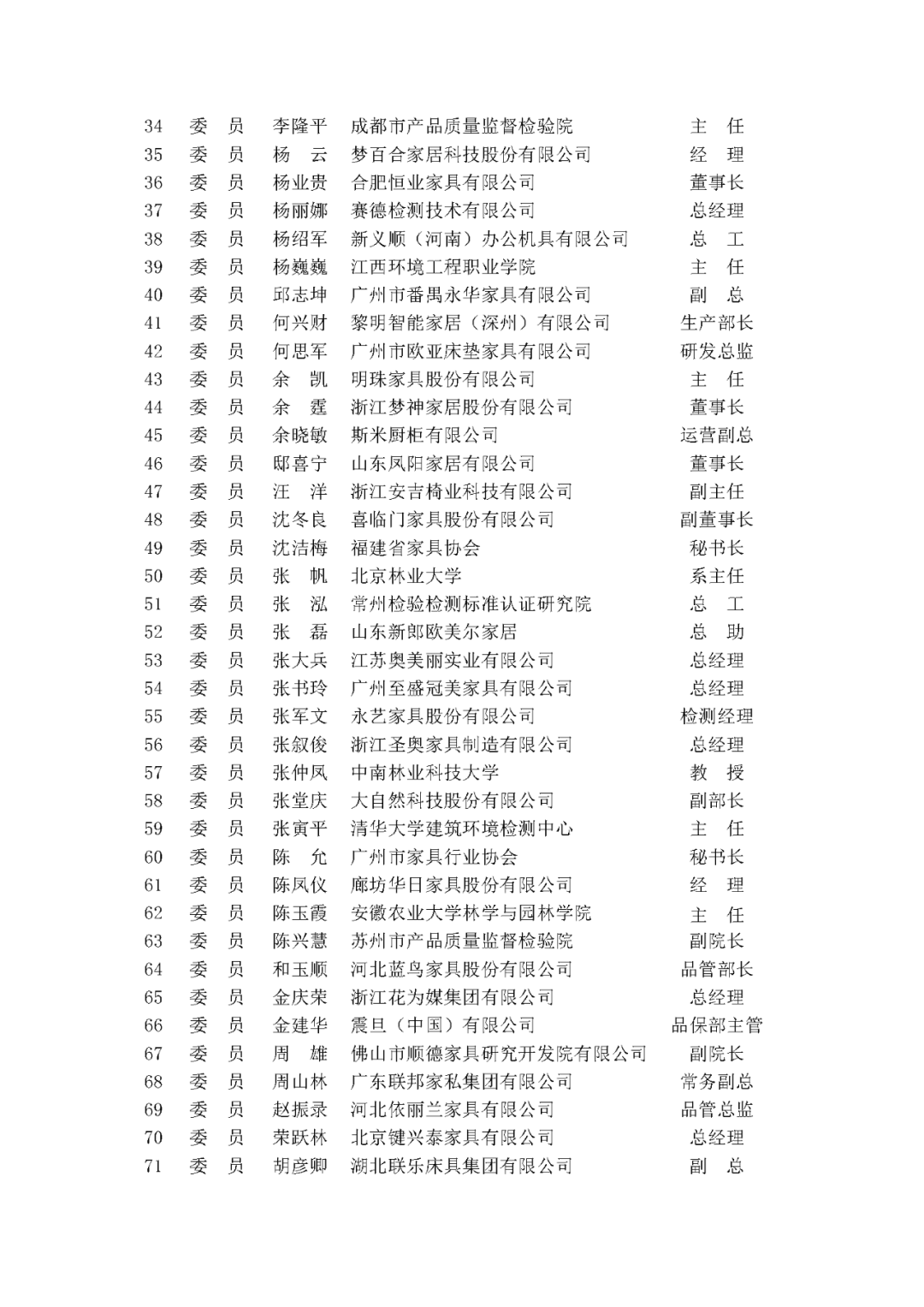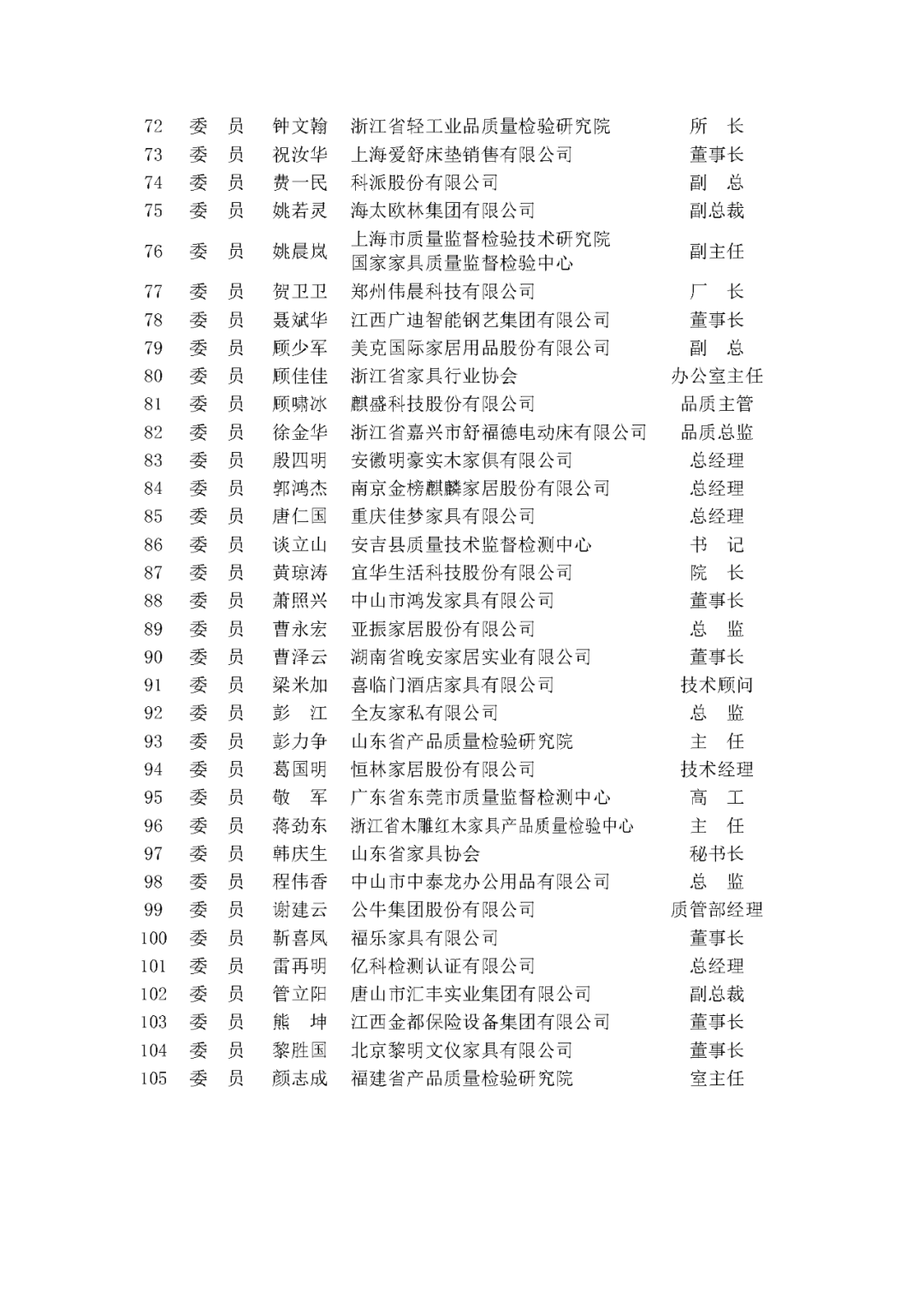 质量标准委员会第二届委员组织架构》。第二届质量标委会委员经本人申请、单位推荐、秘书处审核、会议研究,层层筛选,最终确定105名委员,他们都是家具行业各领域的专家,从事标准化工作多年,拥有丰富的工作经验、专业的理论知识、先进的检测手段和独立的科研能力,能够精准把握行业发展趋势,能够确保质量标委会标准化工作有效落地实施。