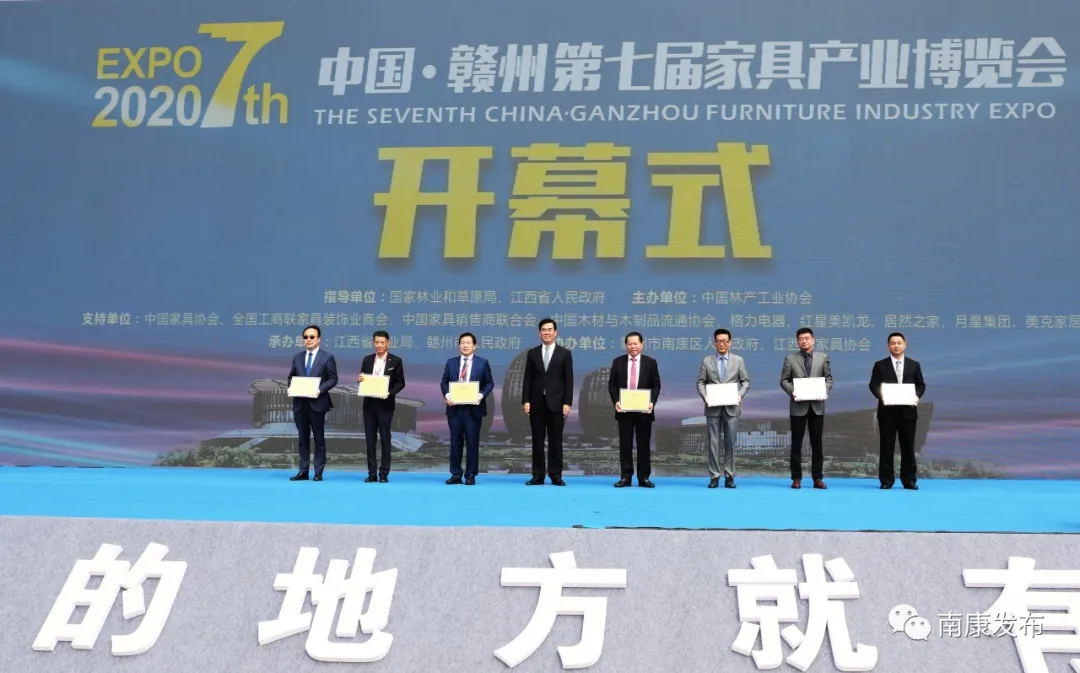 江西省委副书记、赣州市委书记李炳军,为中国(赣州)第七届家博会开幕式现代家具产业链“特别顾问”颁发牌匾。