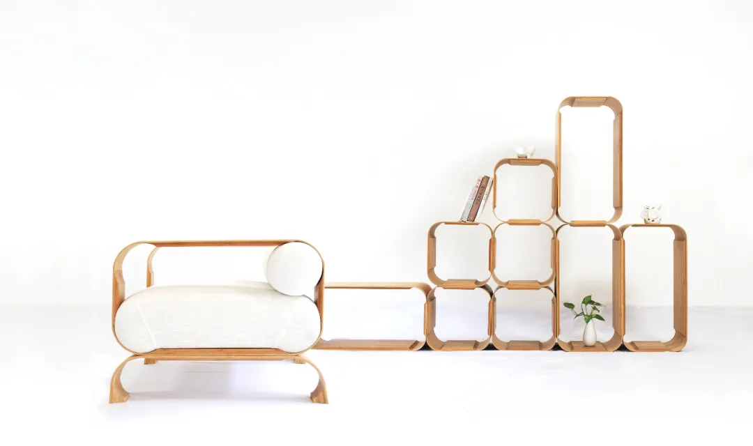 Designer uses the modern material of bamboo glulam by a special technique called Yu Kou which means unique and beautiful bending node. It embodies the traditional process into modern application and extension. The designer utilizes the characteristics of bamboo to make its bending nodes thin. At the same time, the whole frame is made of only one piece of bamboo,so he stabilizes modeling strength by thickening the other parts. Full encirclement structure and bamboo fiber in the right direction make slim appearance able to bear strong pressure.