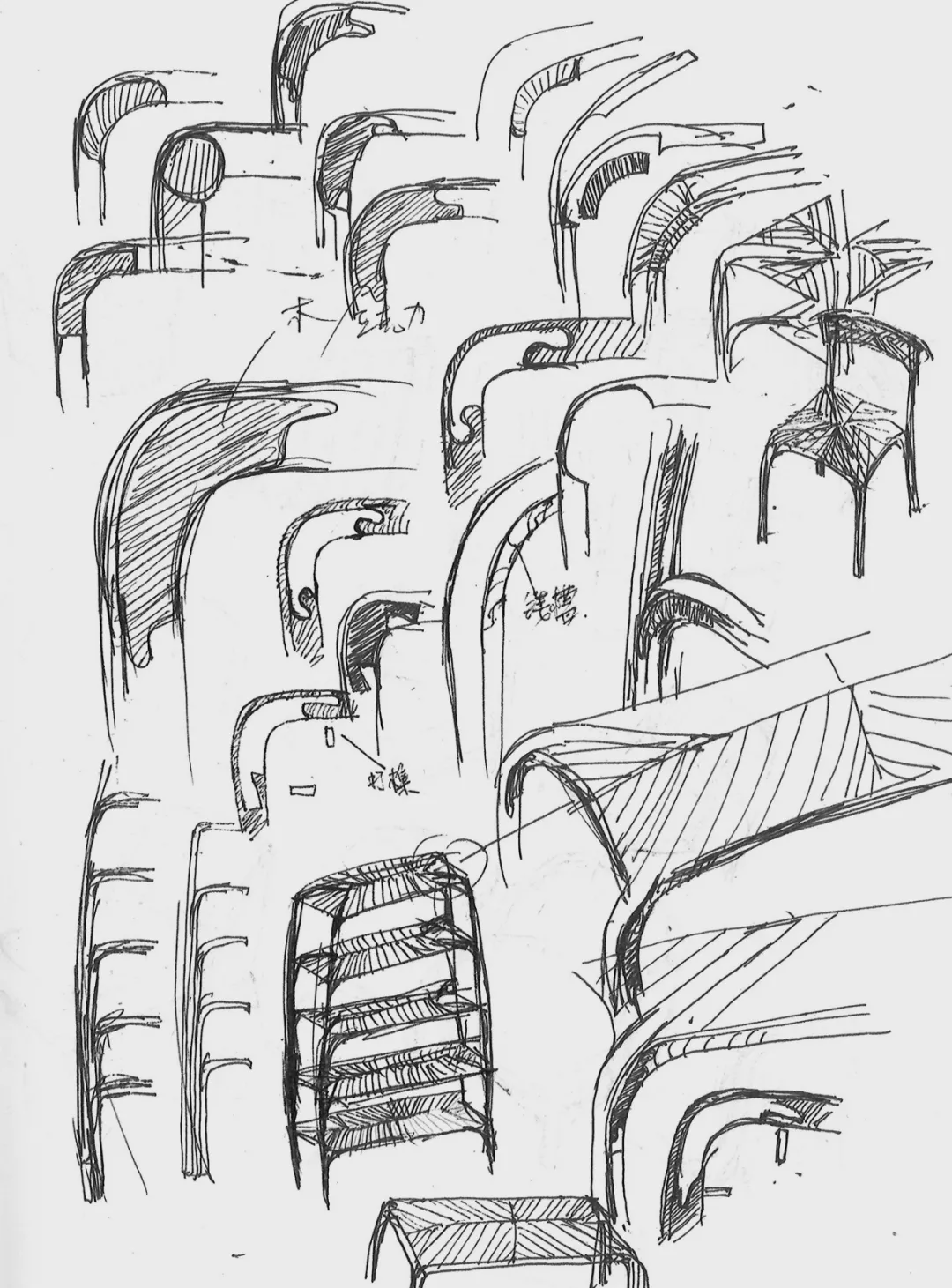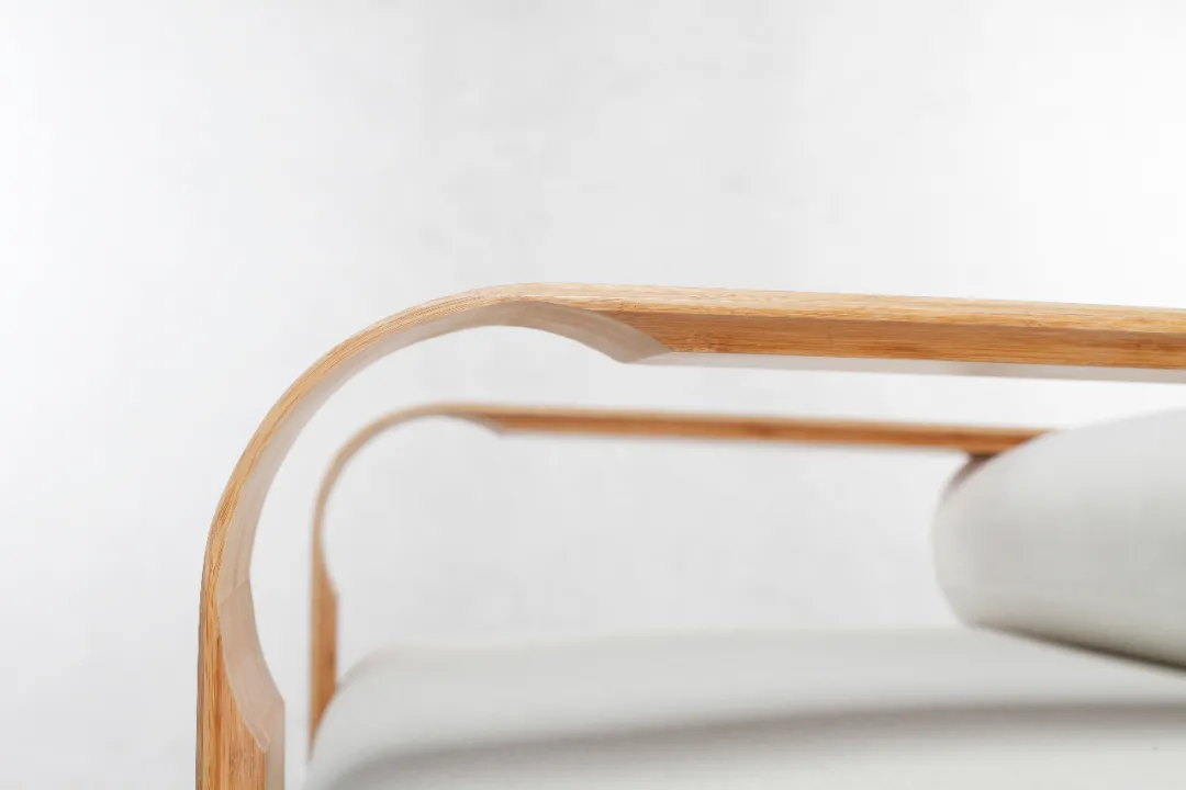郁口是特有而优美的弯曲节点,该设计将其延展并运用至现代材料竹集成材,体现了一种对传统工艺的现代化应用与延展。利用竹的特性将其弯曲节点部分做的轻薄,整体框架仅由一片竹板弯曲而成,通过加厚部分稳固造型强度,全包围的结构与竹纤维的顺向也使纤细的外观能够承受强大的压力。