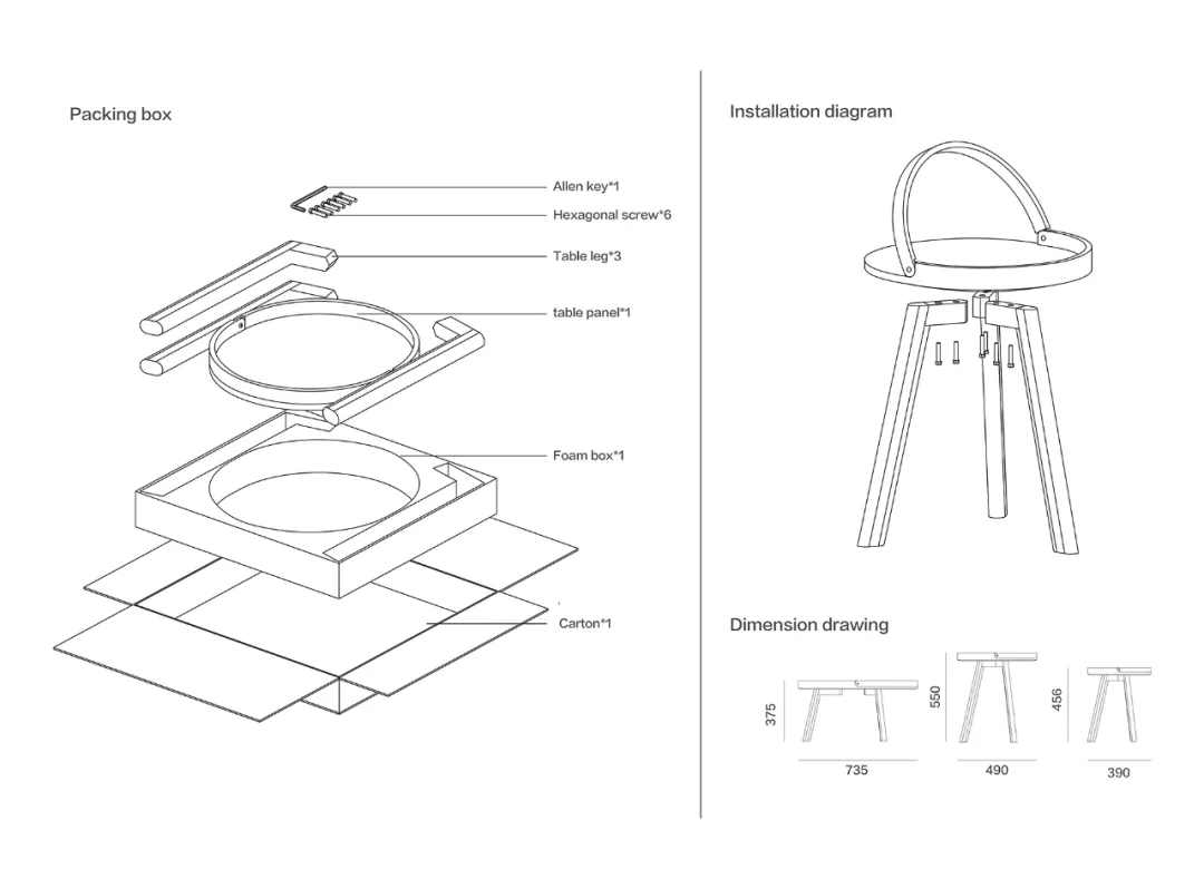 平板化包装降低了存储量和运输成本,这是项目开发中的一个主要考虑因素。组装产品直观明了。顾客只需固定六个相同的螺丝就能够确保茶几的稳固。