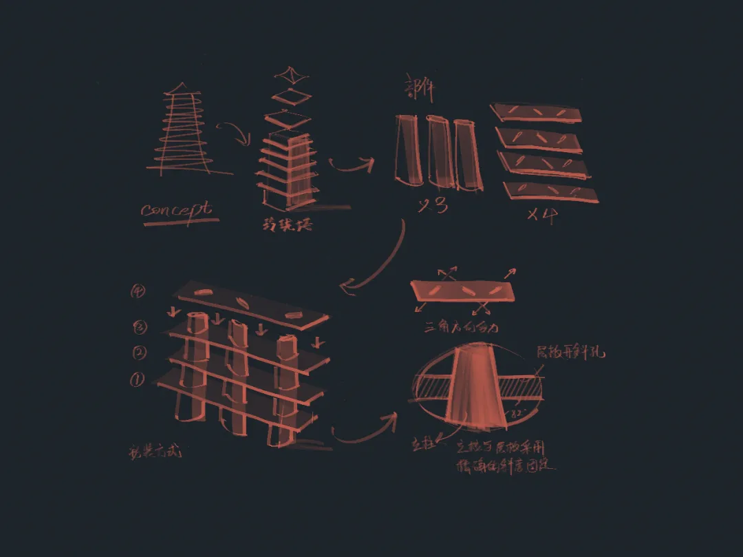The exquisite design method and the extreme requirements for technology lie under this seemingly simple appearance. However, there is no wooden tenon and nail in the whole disassembled structure.It completely depends on the slope of the opening of the laminate and the perfect matching of the column slope.When the laminate is inserted into the columns from top to bottom, the laminate will be fixed and clamped when it reaches the fully matched position,and the three columns with different orientations play a key role in reducing the left and right swing stress, and the gradually thickened laminates in each layer also play a stabilizing role and balance the visual effect with the tower column.