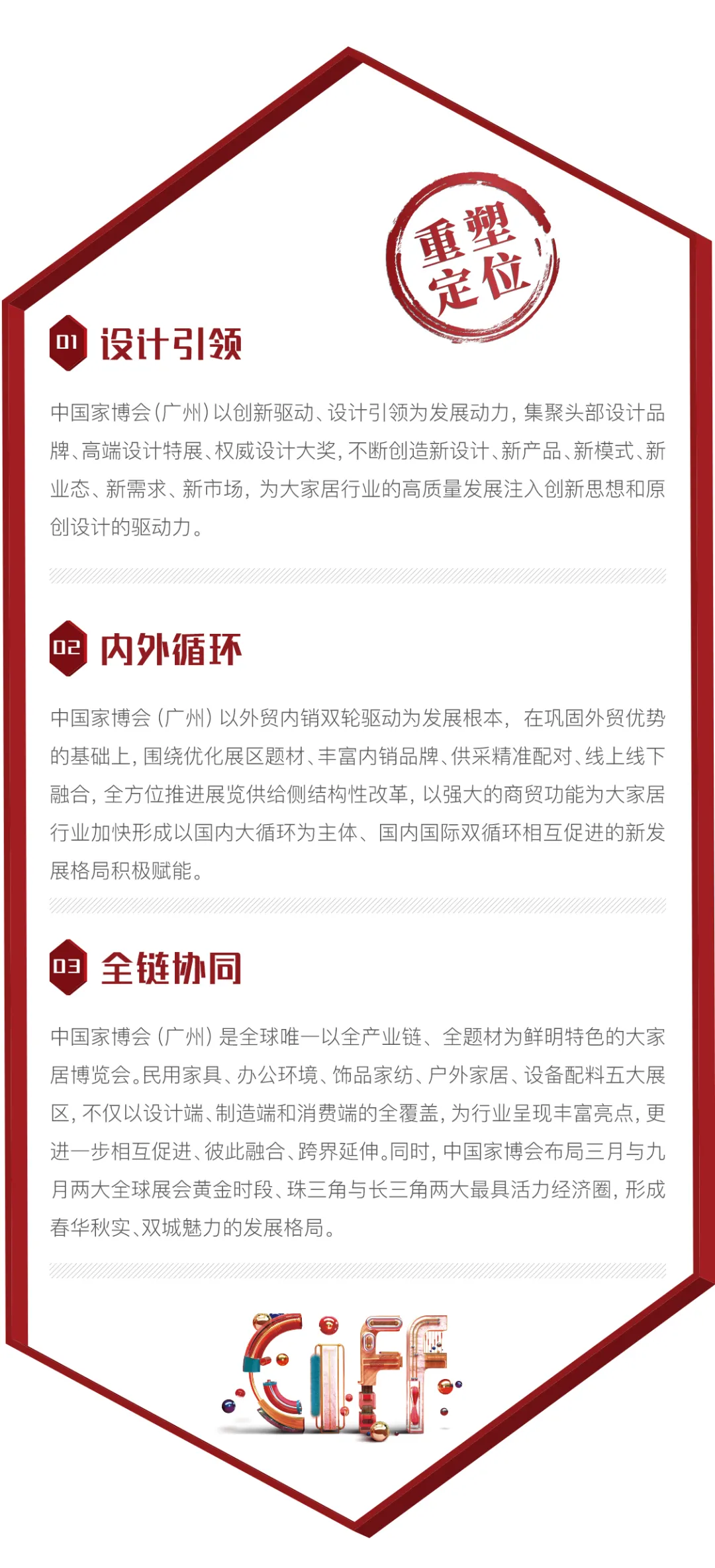 在“设计引领、内外循环、全链协同”的新定位引领下,中国家博会(广州)将全方位进行创新发展,以更前沿更高端的设计特色、更强大更精准的内销功能、更贴心更专业的优质服务,带来一场安全祥和、富有成效的展会,为家居行业的高质量发展积极赋能。