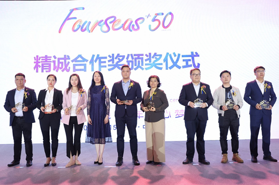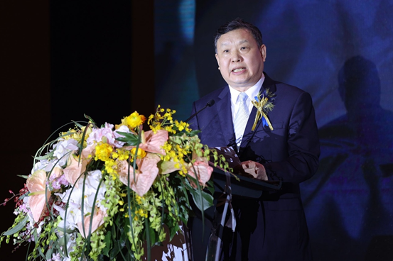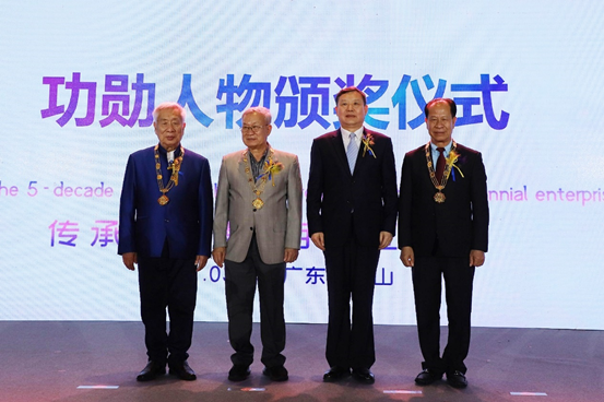 本次庆典上,四海家居授予何志明、何志伟、何志雄“功勋人物奖”,以表彰他们在四海家居五十年发展中做出的贡献。 理事长徐祥楠为他们颁发奖牌。