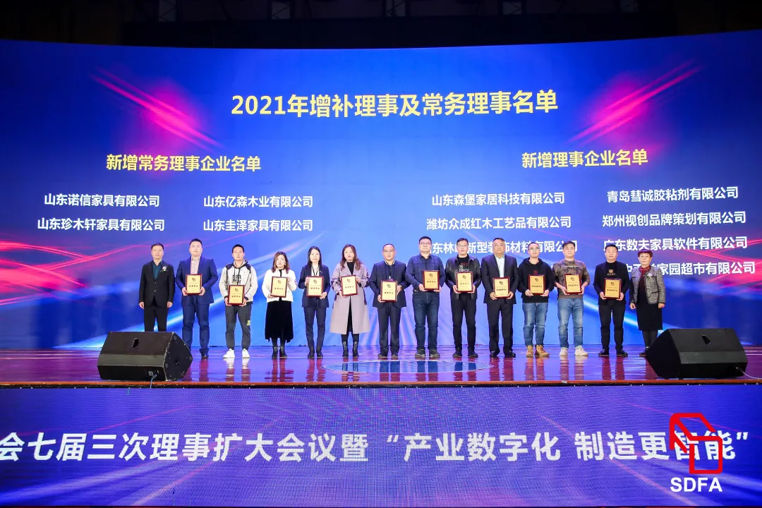 依据协会章程,举行新任会长授牌仪式,山东欧克家具有限公司接任青岛裕丰汉唐木业有限公司成为2022年会长单位。会上,表决通过了山东诺信家具有限公司等4家企业为常务理事单位,山东森堡家居科技有限公司等8家企业为理事单位,山东省家具协会副秘书长王腾宣读2021年增补单位名单,山东省家具协会轮值会长/青岛裕丰汉唐木业有限公司董事长漆勇与山东省家具协会执行会长牛广霞为增补企业颁牌。
