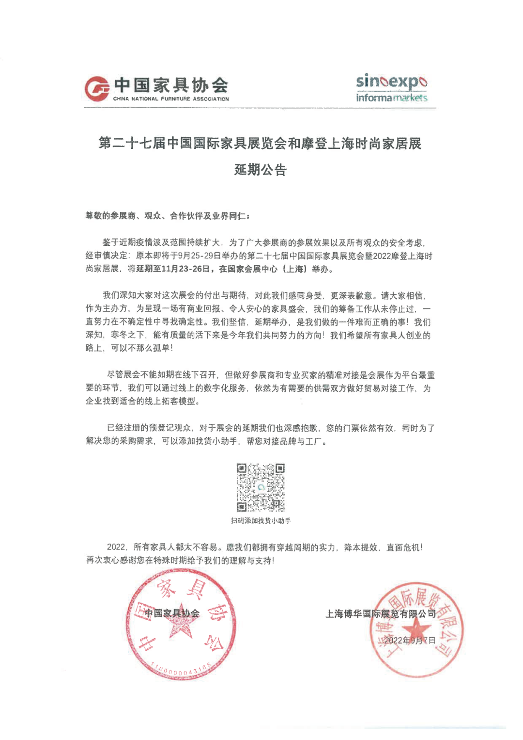 鉴于近期疫情波及范围持续扩大,为了广大参展商的参展效果以及所有观众的安全考虑,经审慎决定:原本即将于9月25-29日举办的第二十七届中国国际家具展览会暨2022摩登上海时尚家居展,将延期至11月23-26日,在国家会展中心(上海)举办。