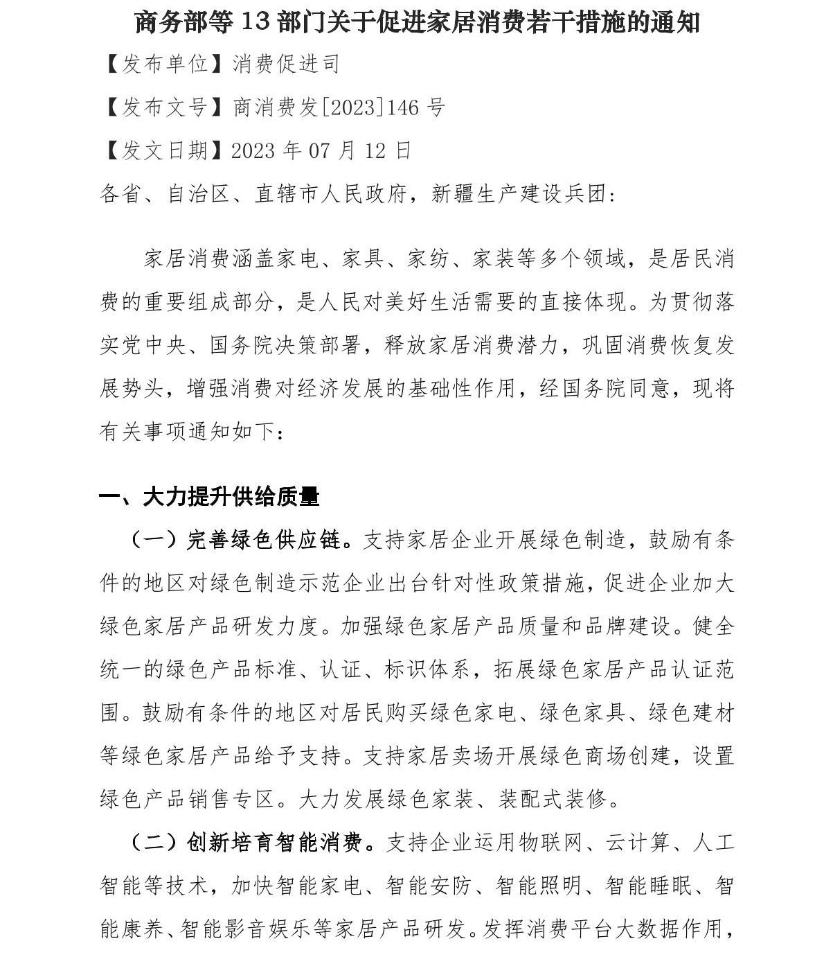 商务部等13部门关于促进家居消费若干措施的通知