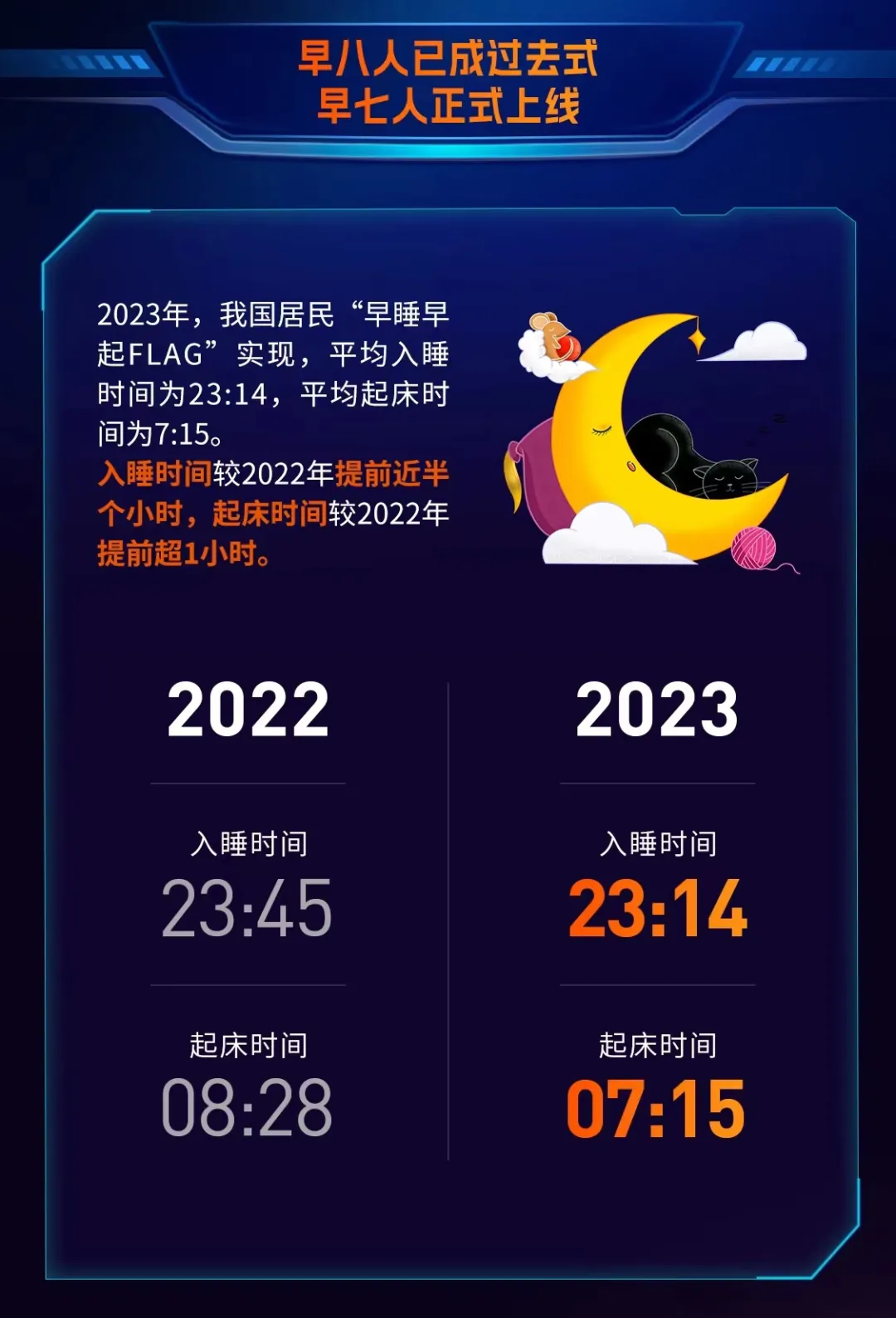 报告调查发现,过去一年人们虽“早睡早起”,但并未让睡眠质量得到实质改善。2023年居民平均入睡时间为23:14,平均起床时间为7:15,入睡时间较2022年提前近半个小时,八点以前起床人群占比为74.5%,高于2022与2021年所占比例。然而,2023年居民睡眠指数为62.61分,较2022年降低了5.16,较2021年降低了2.17;睡眠质量指标变化幅度更大,相比2022年下降了7.51分,相比2021年下降4.8分,均为近三年来最低。