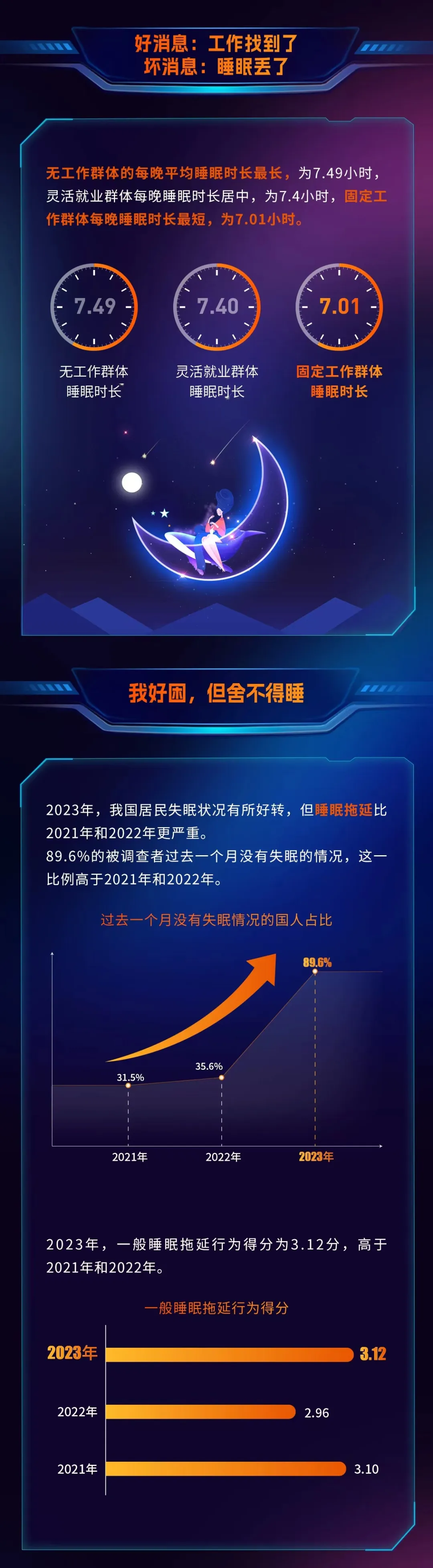 随着社会的发展,智能手机拓展社交、娱乐和学习方式的同时,带来了手机过度使用和可能增长的手机成瘾问题。报告指出,睡前使用手机、上网的行为致使睡眠拖延成为睡眠质量下降的主要原因。相较2022年,人们在2023年睡前使用手机、上网的行为致使睡眠拖延现象更多了。因此,提高睡眠质量,需要降低居民的手机成瘾程度。