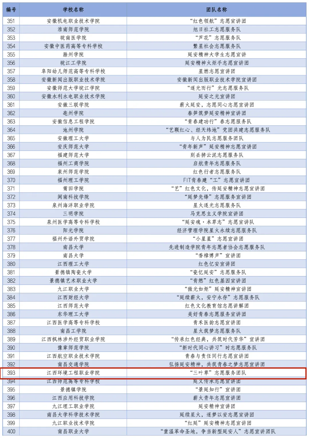 为深入学习宣传贯彻习近平新时代中国特色社会主义思想和党的二十大精神,落实“强国复兴有我”群众性主题宣传教育活动相关要求,引导动员青年学生大力弘扬井冈山精神和延安精神,团中央青年志愿者行动指导中心、全国青少年井冈山革命传统教育基地管理中心近日联合发布了《关于遴选2024年全国大学生井冈山精神志愿宣讲团的公告》;团中央青年志愿者行动指导中心、国家电力投资集团有限公司、共青团陕西省委、中共延安市委近日联合发布了《关于遴选2024年全国大学生延安精神志愿宣讲团的公告》。 活动得到了各高校志愿服务团队的广泛关注和积极参与。主办单位对所有申报材料进行了认真审阅,最终共遴选出1000支高校大学生志愿服务团队。其中江西环境工程职业学院“映山红志愿宣讲团”入选2024年全国大学生井冈山精神志愿宣讲团队;“三叶草”志愿服务团队入选2024年全国大学生延安精神志愿宣讲团队。