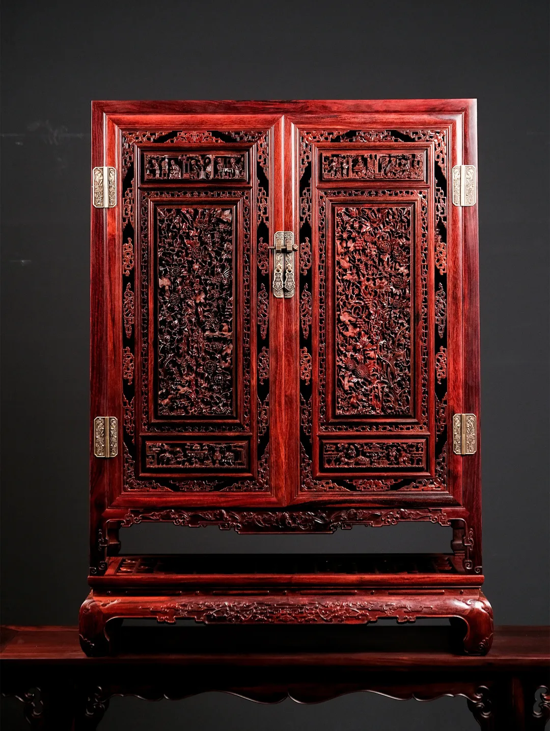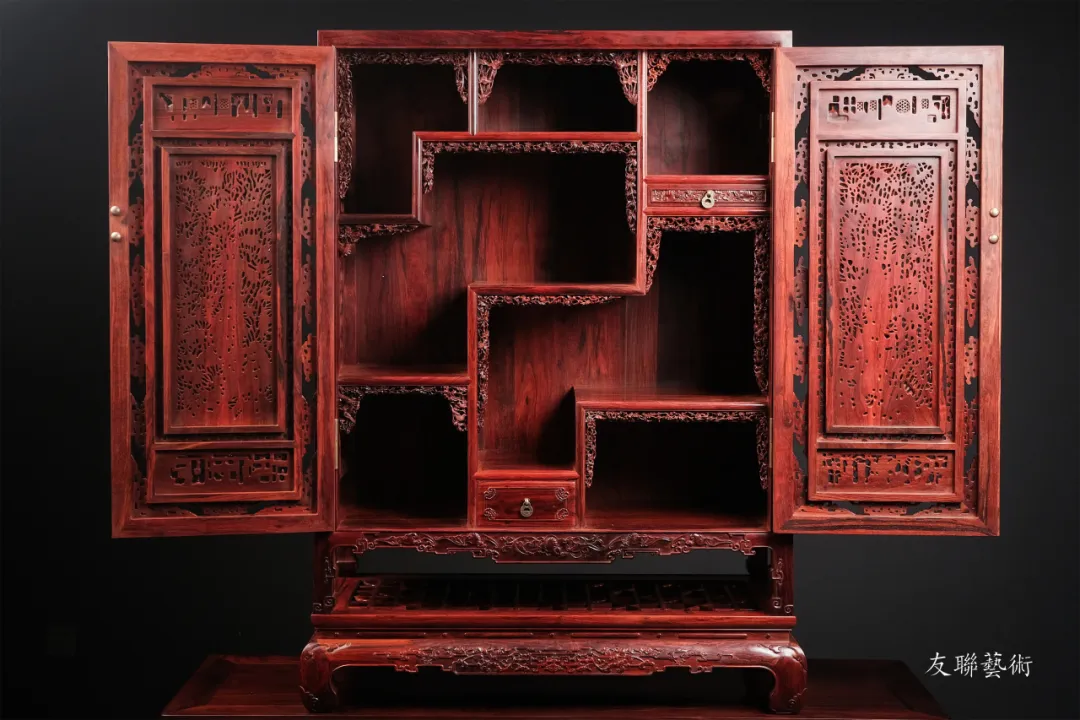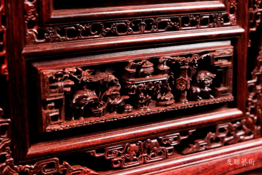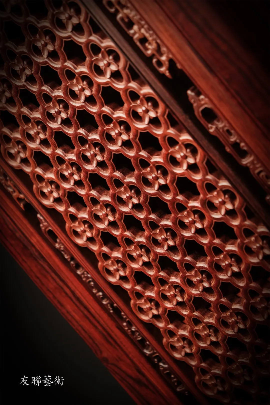 形制规整,柜门设计以三层雕花板攒接而成。外部两圈以透雕为主,镂空雕刻拐子龙纹,繁复精致。两旁则采用镂空窗棂造型,为整体增添了一抹意境之美。