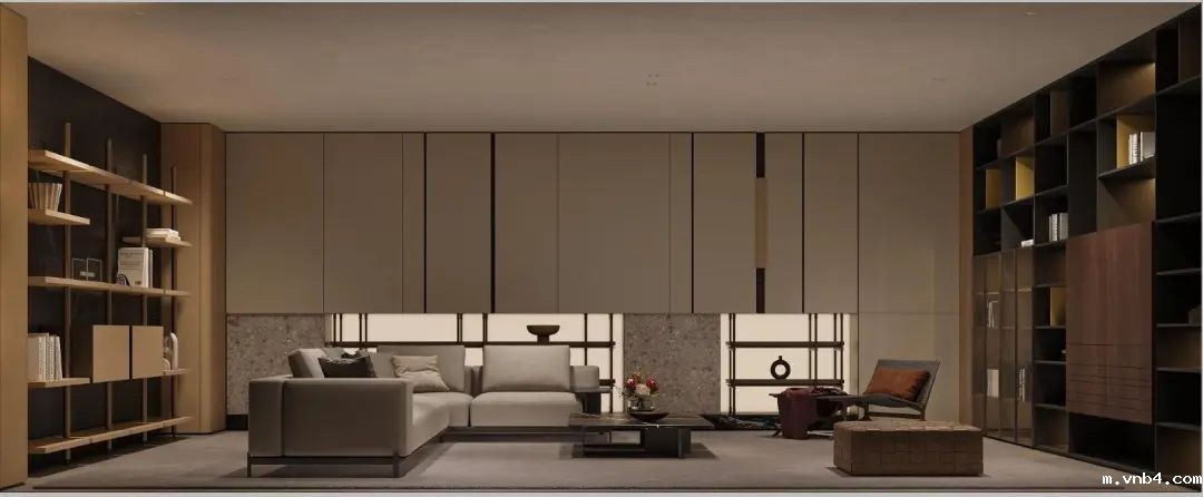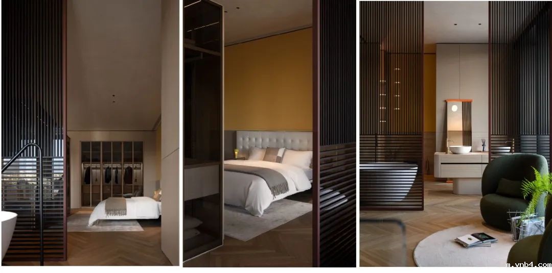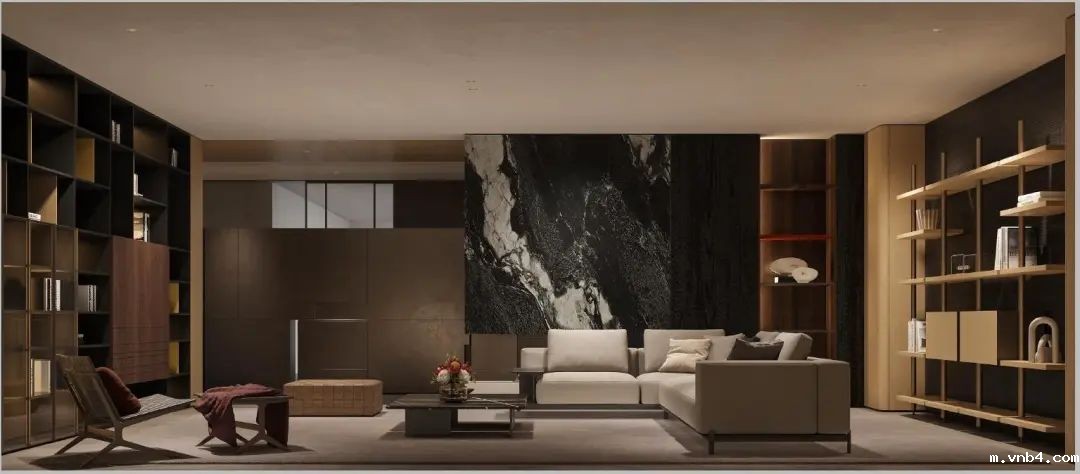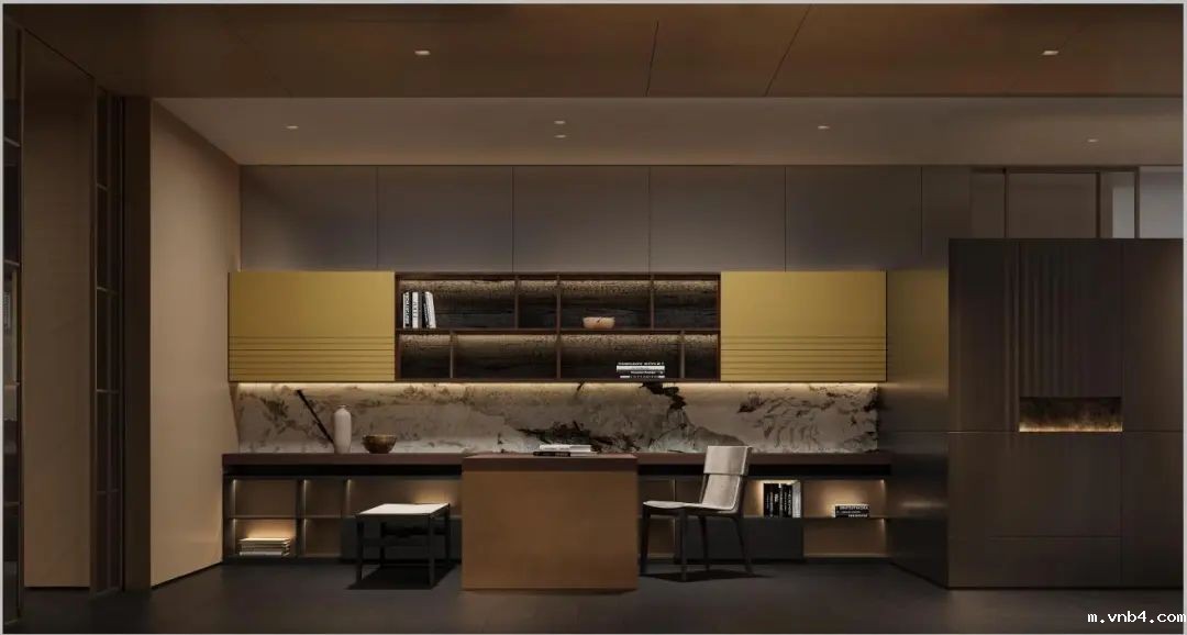 胡桃木主调中融入青岩板与灰金饰面,佐以柠檬黄点睛。材质混搭暗含理性与温度,打造精英阶层的灵感栖居地。