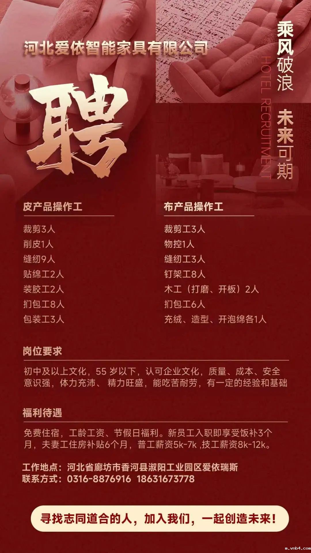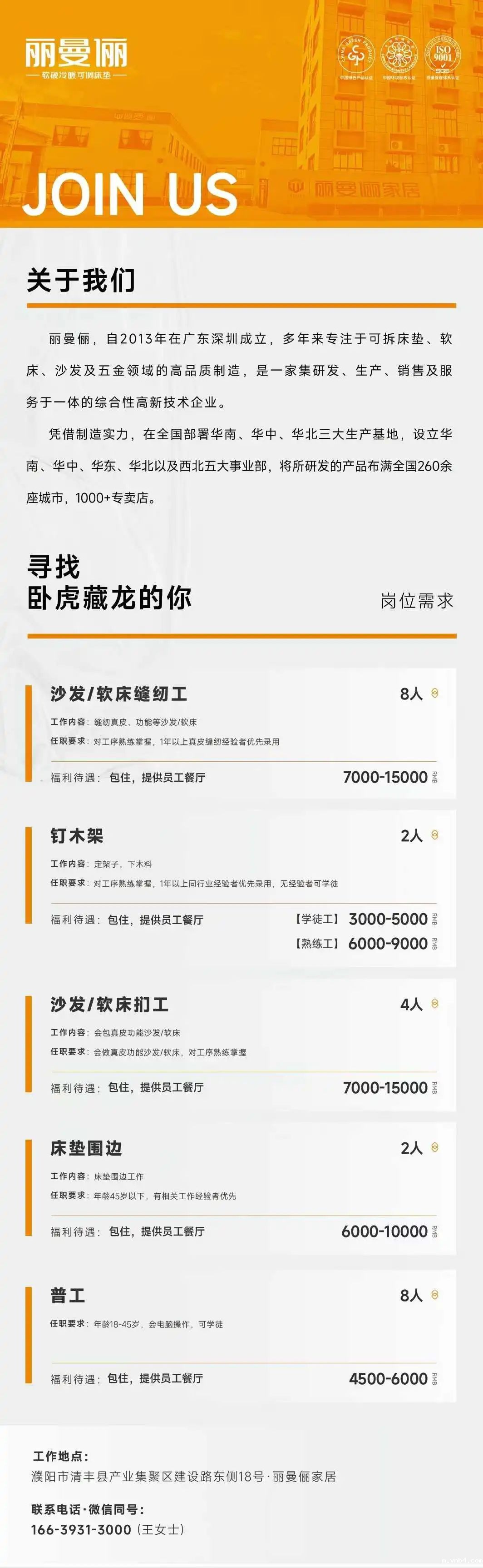 招聘岗位:区域经理、主播、导购、会计、摄影剪辑、直播运营、缝纫工、钉木架、扪工、床垫围边、普工